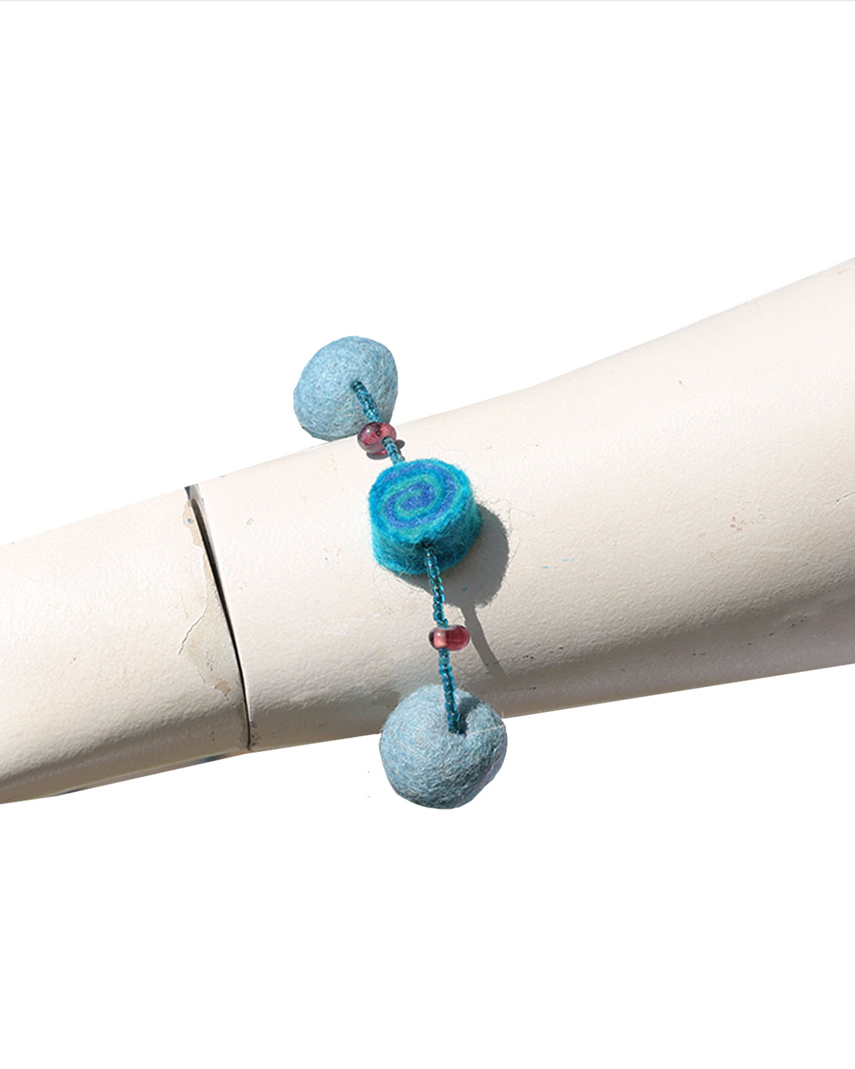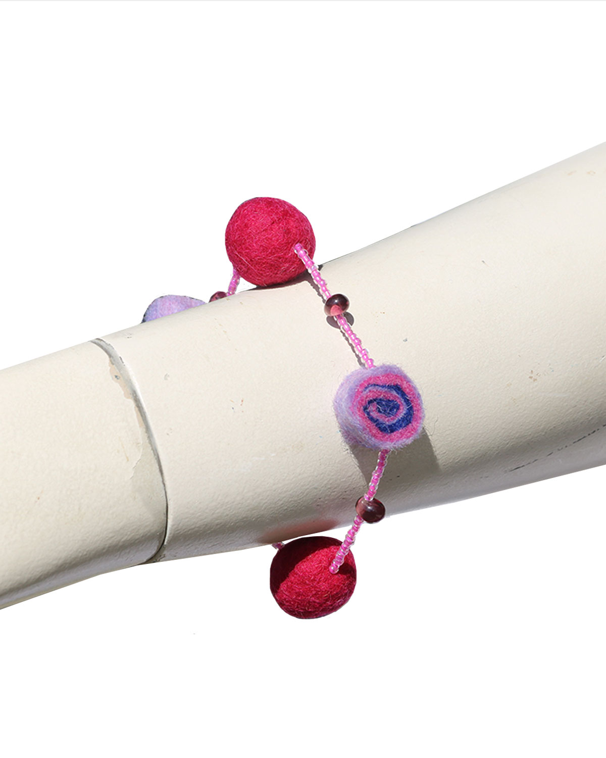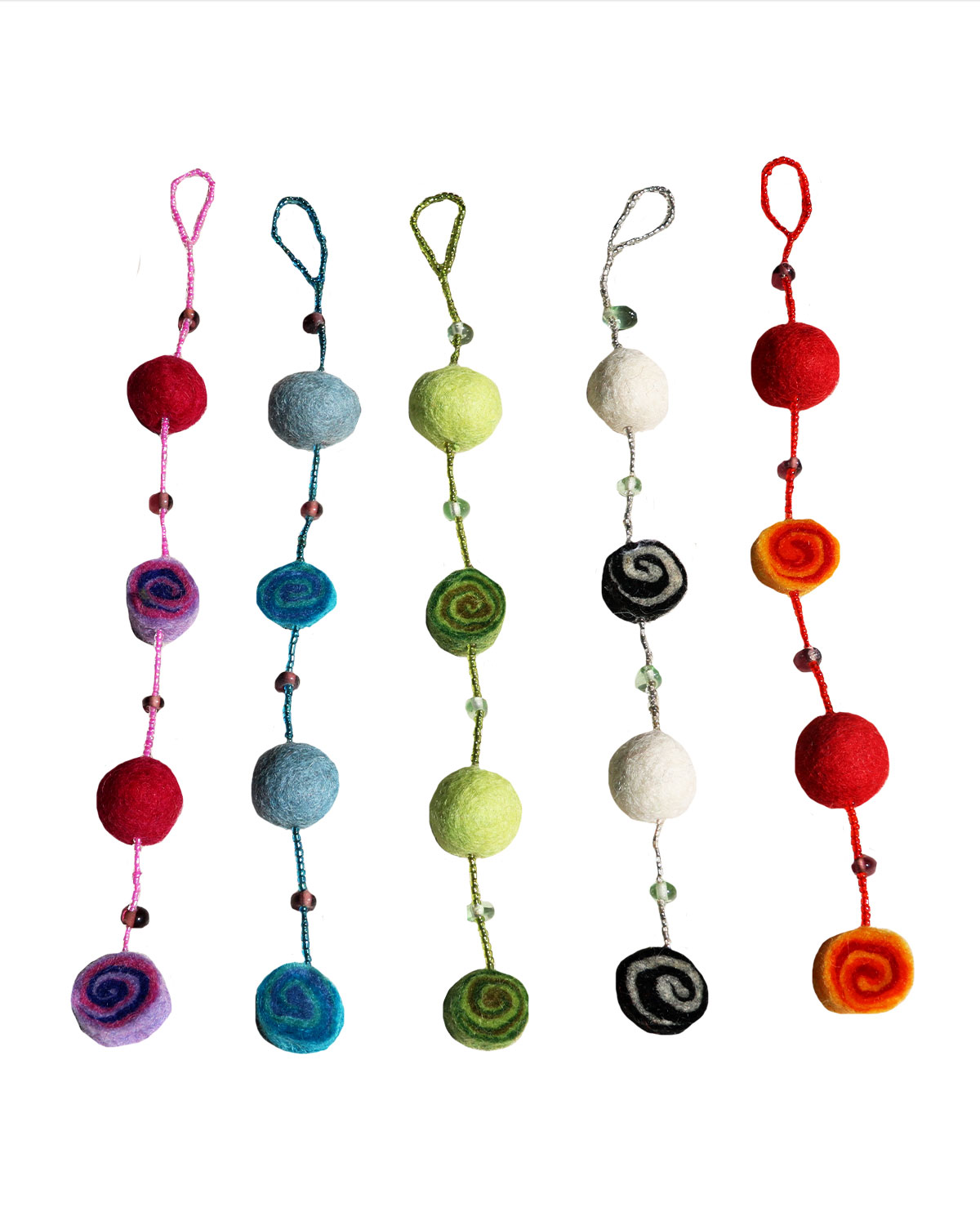 Graziosi braccialetti realizzati in lana cotta, perline e piccole palline in vetro da artigiani nepalesi con tecniche manuali tradizionali del Nepal. Leggeri e morbidi, sono creati con palline tonde in tinta unita e palline piatte con motivi a spirale, intervallate da perline in acrilico e in vetro. Disponibili color bianco e nero, azzurro e turchese, 2 tonalità di verde, giallo e rosso, porpora e violetto. Misure: diametro palline cm 1,8, palline piatte cm 1,8 x 1,1, lunghezza totale aperto cm 24.