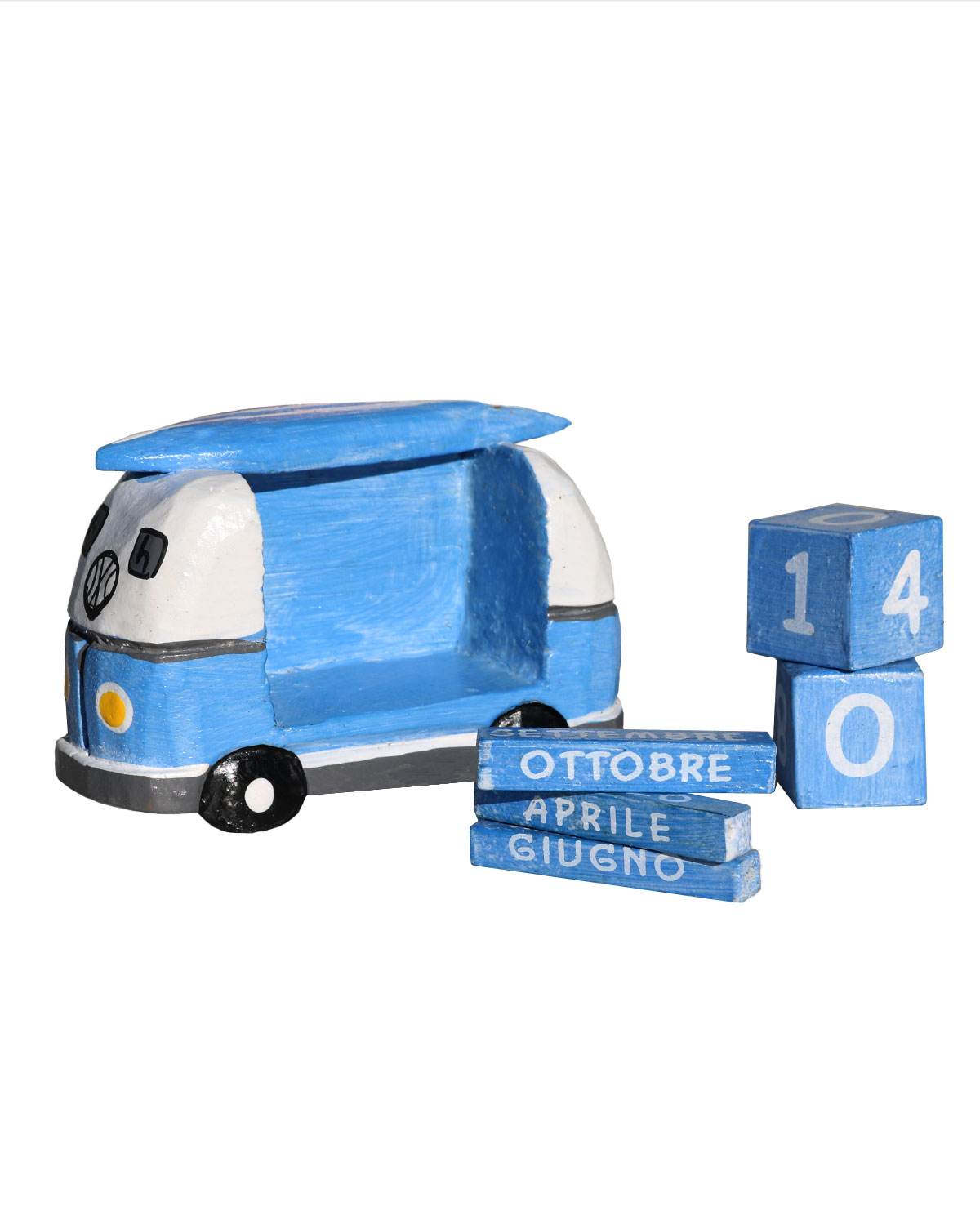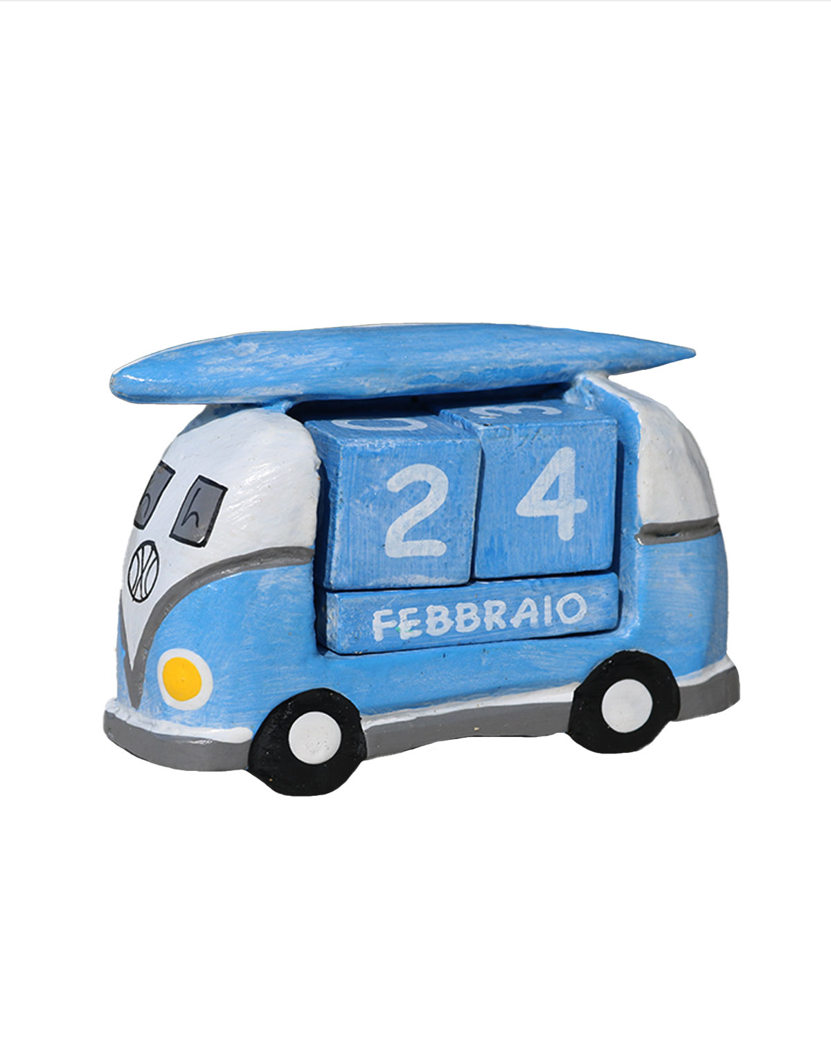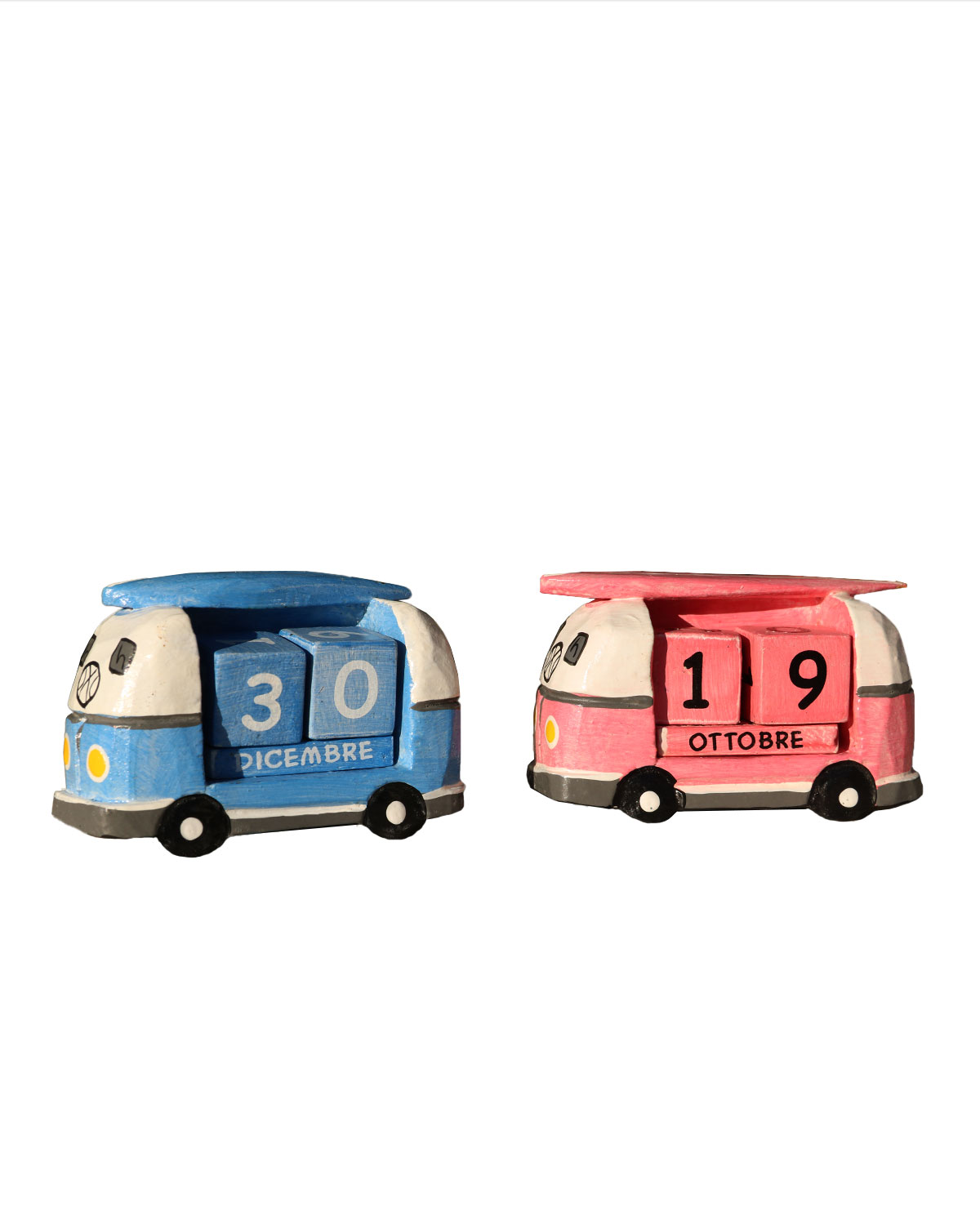 Originali calendari perenni a forma di furgoncino , van Wolkswagen, con una tavola da surf sul tetto, realizzati in legno esotico, intagliati e dipinti a mano da artigiani indonesiani. Simpatici calendari con all’interno due dadi di legno con i giorni e 3 aste anch’ esse di legno con i mesi, tutto si gira e magicamente compaiono tutti i giorni e i mesi dell’anno. Deliziosi sia come calendari che semplicemente come soprammobili . Disponibili color azzurro con particolari in bianco, nero e grigio o rosa con particolari bianchi, neri e grigi. Misure: cm 11 x 4, h cm 7.