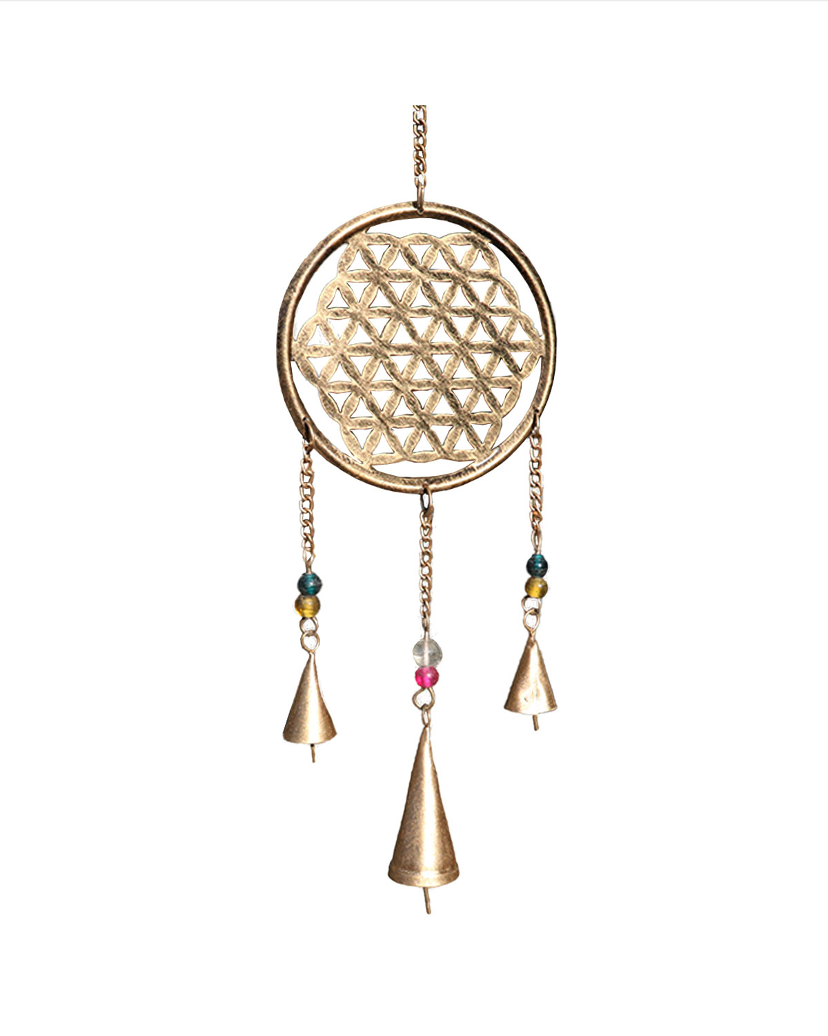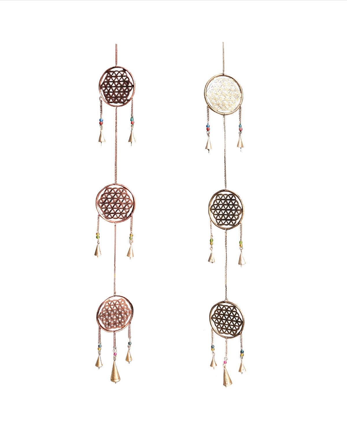 Originali e delicate campane del vento realizzate con rame, ottone e perline di vetro con tecniche artigianali in India, Dal suono delicato si rivelano adatte da appendere sia all’ interno, possibilmente in prossimita’ di porte e finestre che all’ esterno, meglio sotto un portico o al riparo da pioggia battente. Sono formate dai 3 fiori della vita nel cerchio, 2 fili di catenelle ai lati con 2 campanelle e perline di vetro e finale con 3 campanellini e perline in vetro. Disponibili color oro antichizzato o rame con campanellini dorati. Misure: diametro cerchio cm 12,5, lunghezza totale compreso anello d’aggancio e campanella cm 121 circa, diametro campanelle da cm 2,2 a 3,2 circa.