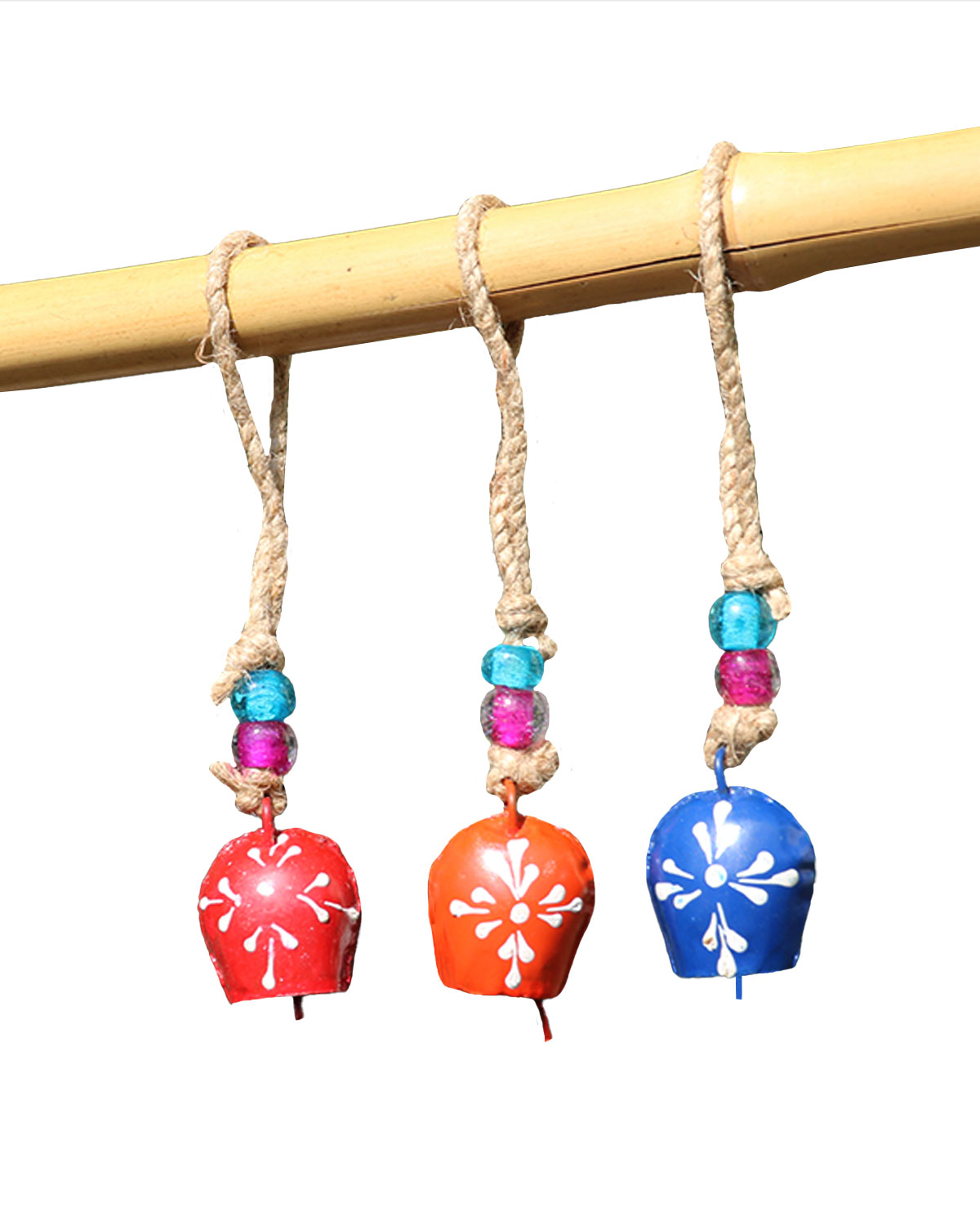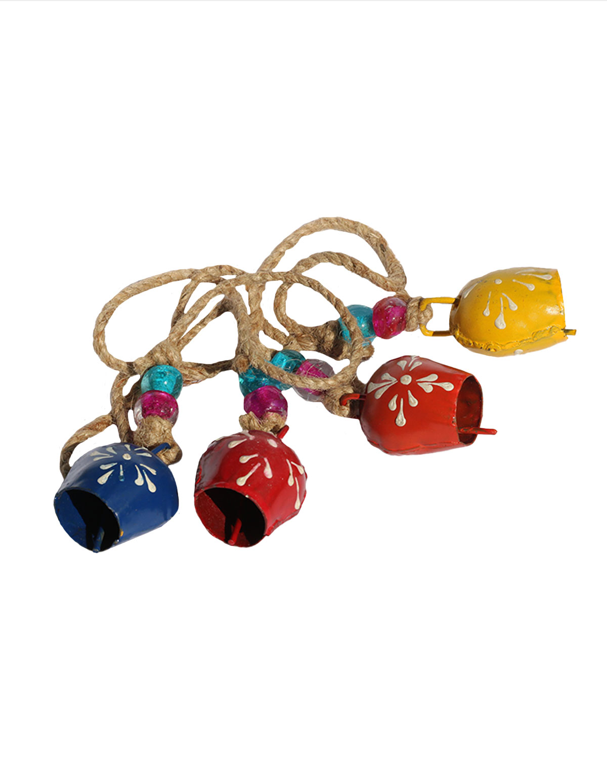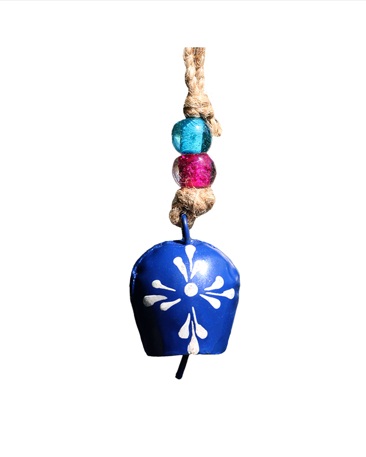 Graziose campanelle realizzate in metallo, corda e perline di vetro con tecniche artigianali in India. Campanelle utili sia per essere suonate che per realizzare decorazioni . La finitura si presenta con decori bianchi su colore tinta unita, due perline colorate e corda per appenderle. Adatte sia appese all’ interno, che all’ esterno, meglio se sotto ad un portico o al riparo da pioggia battente. Presentano un suono delicato. Si prestano bene sia suonate singolarmente che a gruppetto e anche come decorazioni natalizie. Disponibili color rosso, giallo e blu con decori bianchi. Misure: campanella cm 4 x 3,5 x h 4, altezza con corda cm 17 circa.
