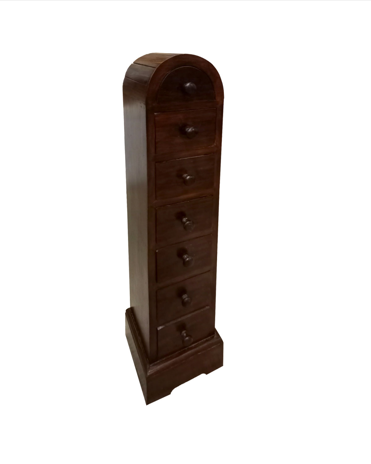 Funzionale e graziosa cassettiera realizzata in legno di teak massello da falegnami indonesiani con tecniche artigianali. E’ composta da 7 cassettini dotati di pomoli. Utile per riporre piccoli oggettini o monili. Bella per arredare qualsiasi ambiente, molto utile come portagioie oper set da cucito. Disponibile in color noce scuro. Misure: cm 23 x 16,5 x h 100.