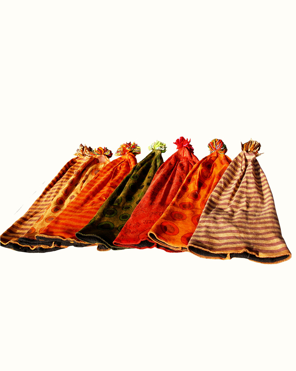 Simpaticissimi cappellini stile elfico, realizzati in cotone elasticizzato a righe o cerchi all’esterno e caldo pile all’interno, da abili sarti nepalesi. Morbide e calde cuffie con colorato pon pon finale. Unisex, disponibili in colori assortiti, come da foto.