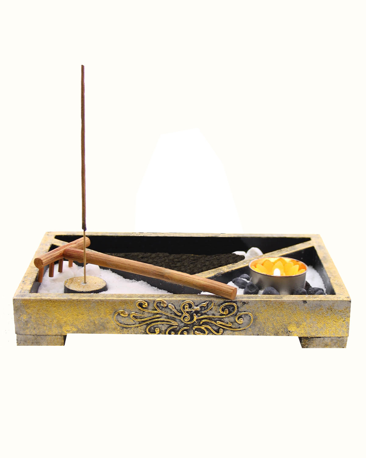 NOTE E SIMBOLOGIA DEI GIARDINI ZEN: I giardini zen, diffusi dai monaci buddhisti, nascono dalla cultura giapponese e vengono realizzati per infondere armonia, pace, indurre allo stato meditativo e ricreare il Ch’i, energia positiva vitale, attraverso elementi naturali densi di profondo significato: la sabbia , rappresenta l’ acqua, simbolo di vita,i sassi rappresentano la solidita’, la pace. Con il rastrello si creano forme ondulate per simboleggiare le onde del mare o altre linee che rappresentano la nostra creativita’ ed interiorita’. Candelina a scopo decorativo ordinabile a parte.