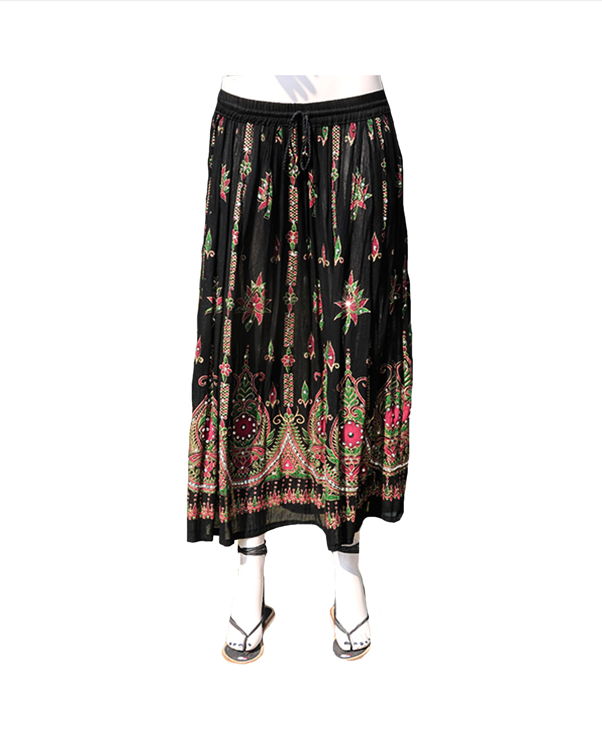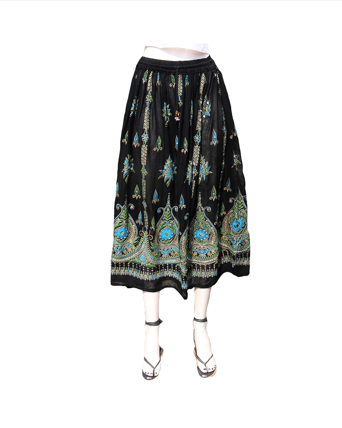 Gonne riccamente decorate in cotone e broccati dorati realizzate artigianalmente in India, con elastico in vita e culisse con campanellini finali. I decori sono realizzati finemente con fili dorati e di raso e completati da pailettes. I motivi sono tipicamente rajastani, tipici di una regione del nord india. Questo tipo di gonna viene usata in questa regione per danze folkloristiche tipiche delle zone desertiche. Taglia unica, con culisse e elastico in vita, regolabile, lunghezza cm 90 circa.