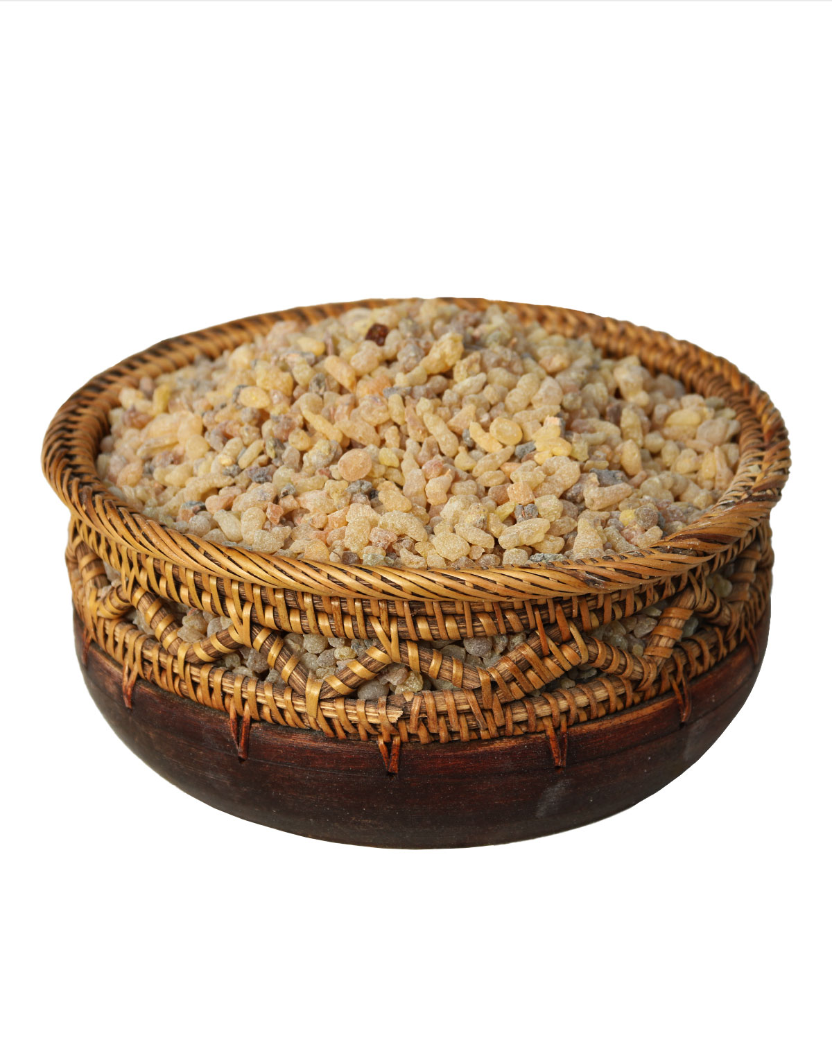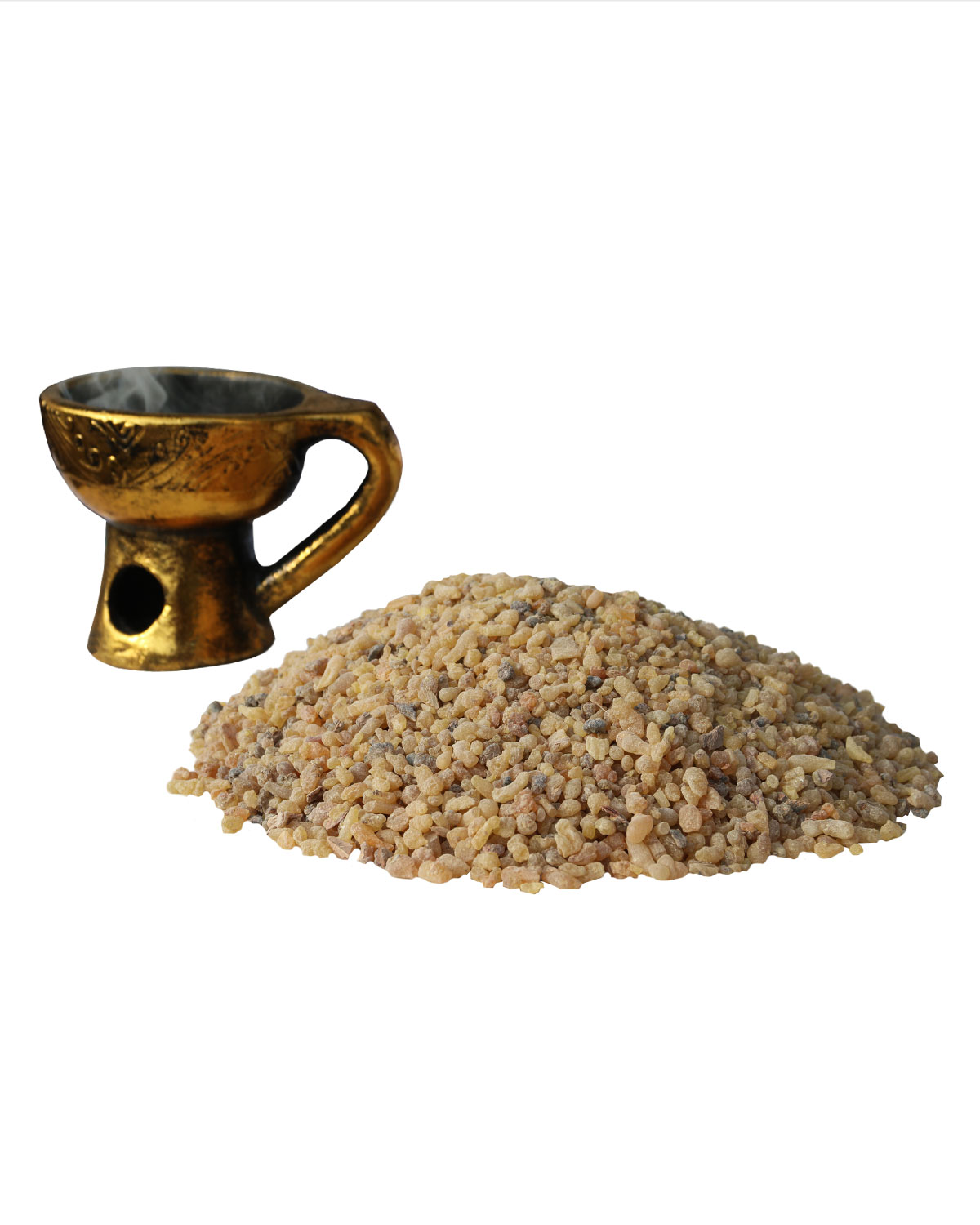 Purissima resina naturale ottenuta dalla pianta di Boswellia, detto anche Incenso o Frankincense, originario dell’ India. Si presenta in grani di diverse misure, dal colore chiaro, tra il giallognolo e il crema. Dall’ aroma intenso su base speziata presenta una leggera nota dolce. Molto usato nelle nostre chiese, in abbinamento anche con altre resine tra cui benzoino e mirra. Si brucia con gli appositi carboncini in pastiglia, con le braci o con bruciatori dotati di robusta retina con tea-light. Disponibile in confezioni da 1 chilo.