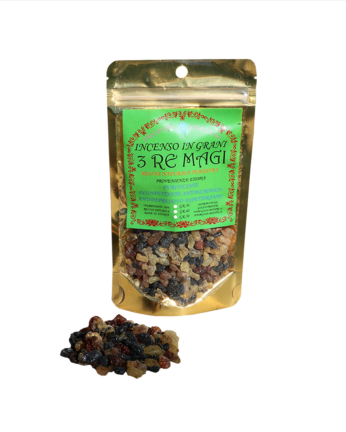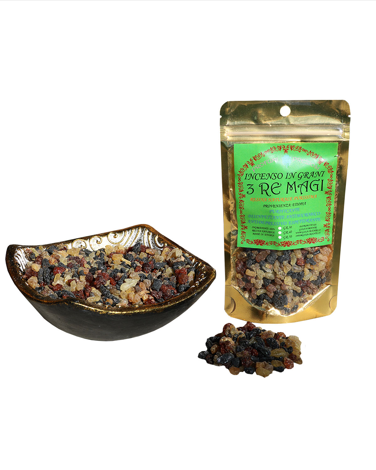 NOTE E STORIA DELL’ INCENSO IN GRANI: Le piante Boswellia crescono ai confini del deserto in una ristretta fascia di terra e sassi chiamata la cintura dell’incenso. La fumigazione dell’incenso, bruciato anche nelle chiese cattoliche, veniva fatta per due scopi principali: per disinfettare gli ambienti e per le proprietà psicoattive. Da sempre si ritiene che questo aroma avvicini l’anima a Dio. Innumerevoli generazioni si sono servite di incenso di Boswellia per la preghiera, il raccoglimento e per entrare in stati meditativi. Si ritiene che l’incenso purifichi gli ambienti interni a noi e ci protegga da ogni influenza negativa e da entità maligne, anche se in sostanza serve soprattutto per concentrare la mente su cose positive. L’incenso agisce sugli stati profondi della psiche, quella parte raffigurata da varie culture come il caos o il maligno. In sostanza aiuta a raggiungere uno stato di equilibrio interiore, sempre suppportato dalla volontà personale. La varietà Guggul, in India, entra tra i rimedi dell’Ayurveda, viene bruciato alla sera, spesso insieme al benzoino, per superare gli stati di nervosismo, recuperare la pace interiore e avere un sonno ristoratore. Un tempo le persone colpite da reumatismi si esponevano ai bagni di fumi dell’incenso, una azione antinfiammatoria che recentemente è stata confermata da alcune università occidentali. Aroma molto orientale, rievoca le moschee del medioriente e naturalmente le nostre chiese. ORIGINE E PROPRIETA’ DEL BENZOINO: l’incenso benzoino è una resina che si raccoglie da incisioni che compaiono sui tronchi di alcuni alberi chiamati Styrax Benzoin e Styrax Tonkinensis. L’albero produce una sostanza liquida che a contatto con l’aria si solidifica e assume la tipica colorazione scura. Tra gli incensi utilizzati, il benzoino è tra quelli più conosciuti e scelti per le sue spiccate proprietà. La sua origine è attribuita all’isola di Giava, dove ancor oggi viene raccolta e venduta. L’incenso al benzoino ha proprietà antimicrobiche, antimicotiche, disinfettanti. Il Benzoin purifica l’aria, soprattutto in caso di ambienti molto affollati, chiusi per diverse ore o in caso di virus influenzali presenti. La sua azione balsamica stimola i processi naturali di difesa dell’organismo. Quando l’aroma di questo incenso si diffonde nell’aria, le sue note calde svolgono una funzione tonica e contrastano l’ansia e lo stress, svolgendo una funzione antidepressiva. E’ uno dei rimedi più antichi mai conosciuti utilizzato dalle popolazioni asiatiche, mediorientali per preparare medicinali utili alla protezione della pelle. La sua azione disinfettante, cicatrizzante e lenitiva lo rendeva uno dei rimedi scelti per la cura del corpo e grazie alla sua azione sedativa veniva utilizzato per curare le affezioni del tratto respiratoria. MIRRA: La tradizione cristiana ha contribuito a rendere più conosciuta questa sostanza, perché si narra che uno dei Re Magi la portò in dono al Bambino Gesù. Gli antichi Egizi la utilizzavano per imbalsamare i corpi e la tradizione nel tempo ne ha fatto uno dei rimedi naturali più conosciuti. La Mirra è una resina che si ottiene dal Commiphora, un arbusto spinoso diffuso in molte zone dell’Africa e dell’India. Si raccoglie in estate: sul tronco della pianta sono presenti nodi e rigature che rilasciano un liquido giallastro, complici le alte temperature in cui vive. La resina si crea sotto forma di liquido all’interno del tronco, che diventa così il suo serbatoio. Viene utilizzata a scopo terapeutico in forma essicata, oppure estraendo il suo prezioso olio essenziale, ricco di chetoni, steroli, sesquiterpeni e polissaridi. La resina che fuoriesce dalla corteccia dell’albero in forma solida può essere utilizzata in diversi modi, il più comune è l’incenso. Il suo odore forte e intenso presenta noti acri e agrodolci allo stesso tempo. Da sempre viene utilizzata per il trattamento delle infezioni respiratorie e per le sue proprietà espettoranti. Accendere un incenso a base di mirra permette di ottenere benefici sulla persona e sull’ambiente. La mirra ha diverse proprietà: espettoranti, favorendo infatti l’eliminazione del catarro e aiutando il distacco dai tessuti in cui si è formato. Disinfettante: la mirra diventa un ottimo disinfettante per le vie respiartorie e per l’ambiente circostante. La sua potenzialità antibatterica la rende un’ottima alleata nei momenti di maggiore tensione, nei cambi di stagione e durante un’influenza. Antiparassitario: l’aroma particolare che sprigiona, la rende un rimedio efficace per allontanare insetti e debellare parassiti.
