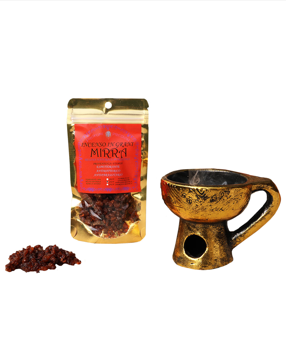 NOTE SULLA MIRRA: La mirra è una resina che si ottiene dal Commiphora, un arbusto spinoso diffuso in molte zone dell’Africa e dell’India. Si raccoglie d’estate: sul tronco della pianta sono presenti nodi e rigature che rilasciano un liquido giallastro, complici le alte temperature in cui vive. La resina si forma sotto forma di liquido all’interno del tronco, che diventa così il suo serbatoio. Viene utilizzata a scopo terapeutico in forma essicata oppure estraendo il suo prezioso olio essenziale, ricco di chetoni, steroli, sesquiterpeni e polisaccaridi. La resina che fuoriesce dalla corteccia dell’albero in forma solida può essere utilizzata in diversi modi, il più comune è l’incenso. Accendere un incenso a base di mirra, permette di ottenere benefici sulla persona e sull’ambiente. Ha proprietà espettoranti, disinfettanti, antiparassitarie e favorisce benefici respiratori. Sotto forma di incenso la mirra sprigiona le sue proprietà attraverso la combustione e prepara l’ambiente, purificandolo. E’ assolutamente consigliato nei luoghi in cui vi lavorano più persone, perché disinfetta l’aria, negli ambienti in cui giocano i bambini, da utilizzare periodicamente, per ripulire stanze, disinfettare l’aria e ottenere così un ambiente sano e pulito.