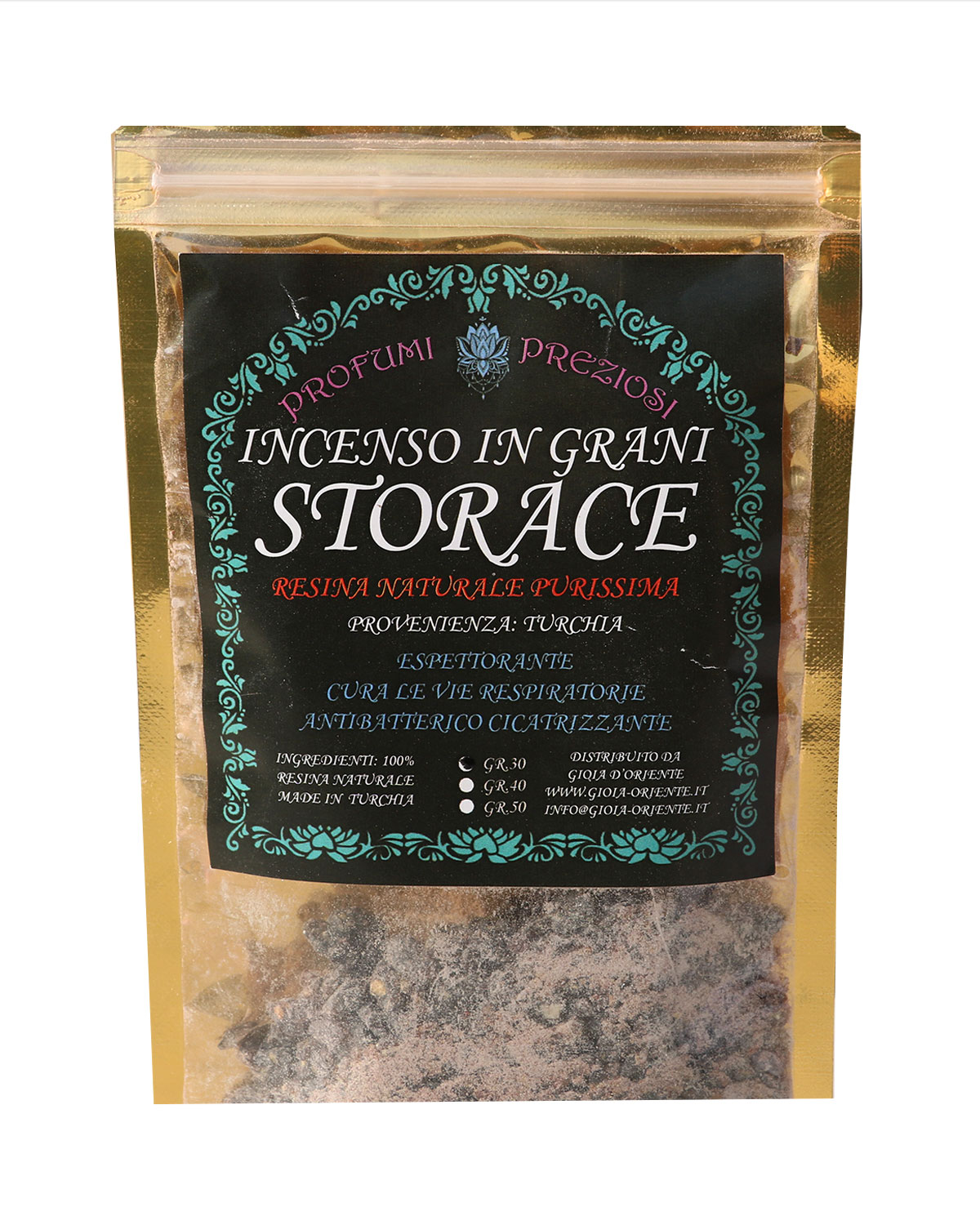 PROPRIETA’ E CARATTERISTICHE DELLA RESINA STORACE: Noto fin dall’antichità, lo Storace nero è il pregiato e famoso balsamo aromatico dell’Asia Minore e si ottiene dal Liquidambar Orientalis (Hamamelidacee), una pianta ad alto fusto che vegeta nelle impenetrabili foreste anatoliche del Marmaris. Ancor oggi la sua produzione è effettuata secondo la procedura originaria: energicamente percossa, la pianta in qualche settimana genera un denso siero patologico (lo storace resinoide, rinomata materia prima della profumeria). Questo viene successivamente asportato onde amalgamarlo con la corteccia del fusto (preventivamente triturata) e il tutto rimane quindi sepolto per alcuni mesi. La fortunata macerazione che ne deriva dà origine al profumatissimo Storace nero. Da tempo immemorabile si usa sia bruciare questo balsamo insieme all’incenso, che come efficace deodorante. In entrambi i casi inebrierà l’ambiente con il suo orientale ed inconfondibile profumo dolce-ambrato. Lo storace è utile come diuretico, espettorante e per le sue proprietà antibatteriche può essere usato anche per curare il mal di gola. Il suo profumo intenso non è adatto alle donne in gravidanza o durante l’allattamento. Come le altre resine pregiate (l’incenso e la mirra), lo Storace possiede stupefacente proprietà cicatrizzante ed espettorante ed un’affinità particolare con il cavo orale. Indicato nella cura di malattie come tracheite, tonsillite e gengivite.