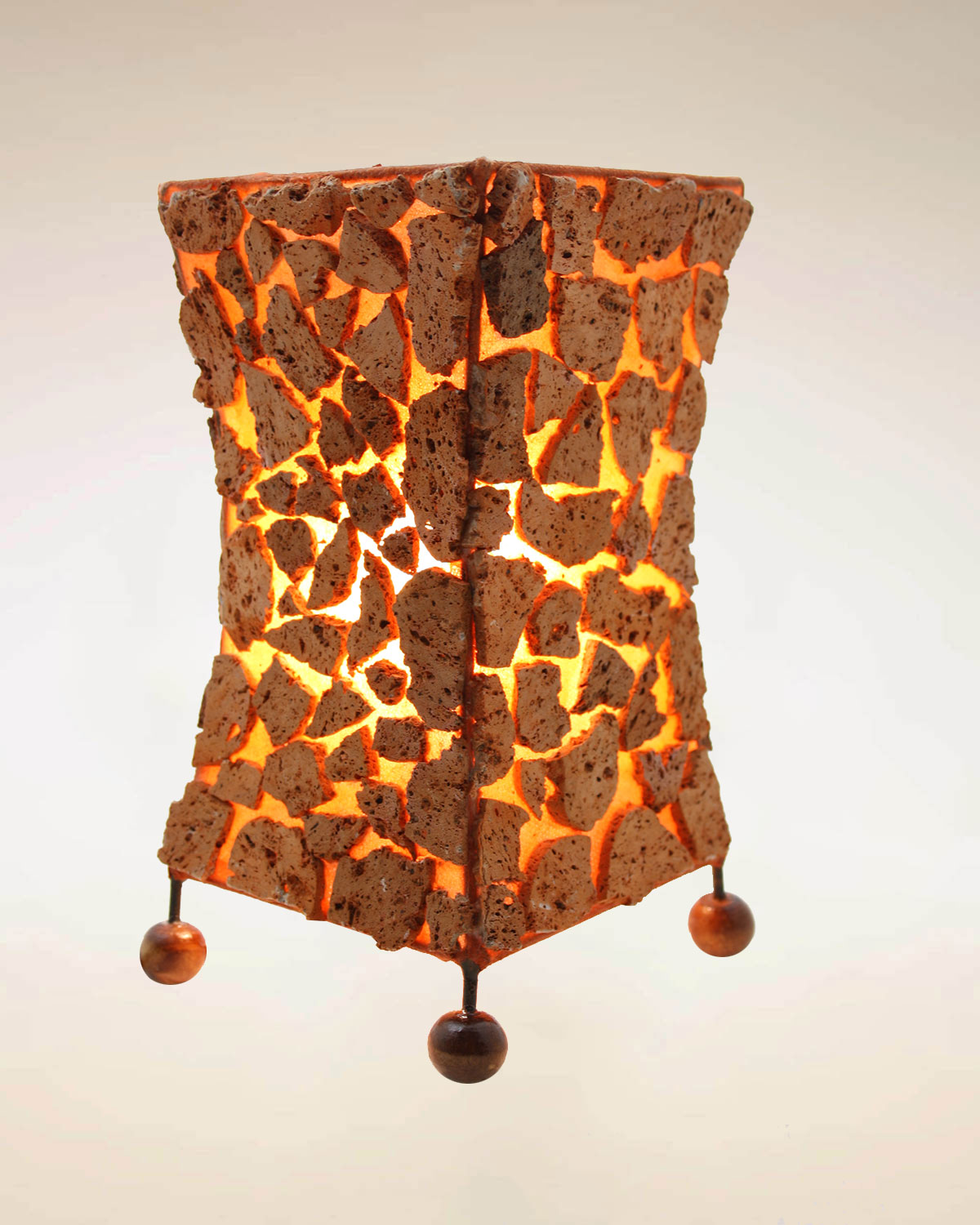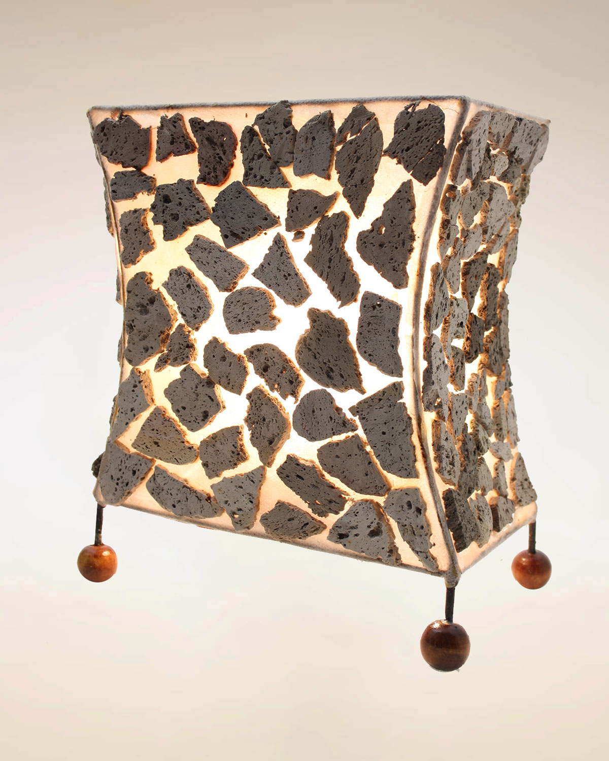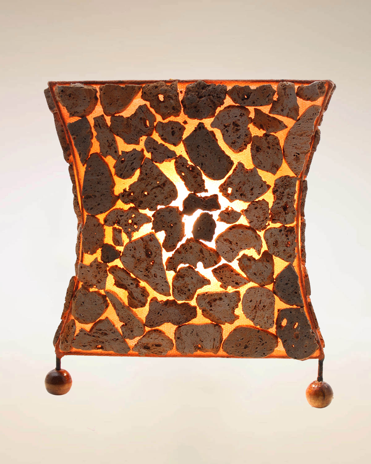 Originali lampade realizzate in Indonesia con tecniche artiganali con pezzetti di pietra irregolare colorata a mosaico applicata su supporto tipo stoffa. Disponibili in color beige o arancioe nelle forme quadrata slim o rettangolare slim. Dal sapore piuttosto rustico si adattano bene per taverne e ambienti arredati con legno. Misure quadrta slim: base cm 12,5 x 12,5 x h 21,5. Rettangolare slim: base cm 19,5 x 11,5 x h 21. Dotate di impianto elettrico a norma.
