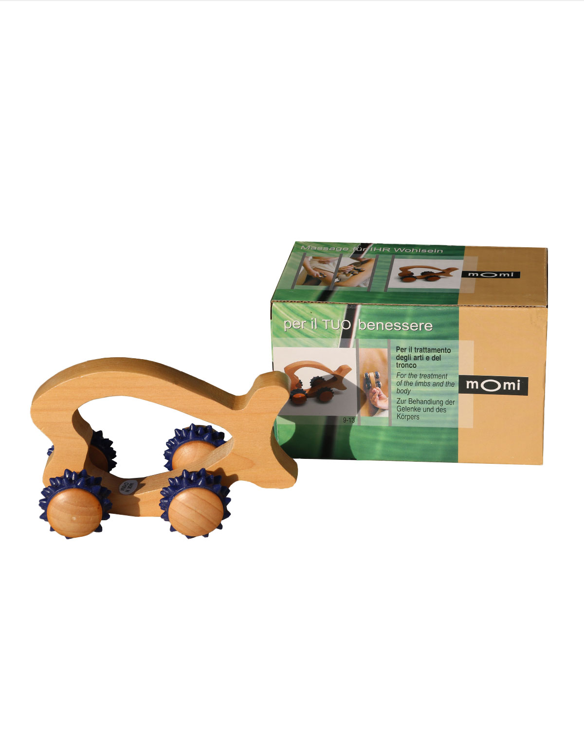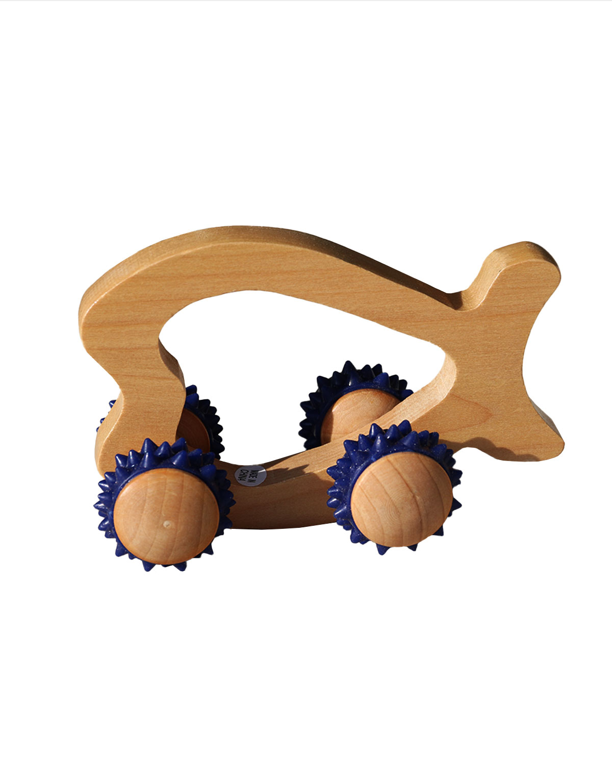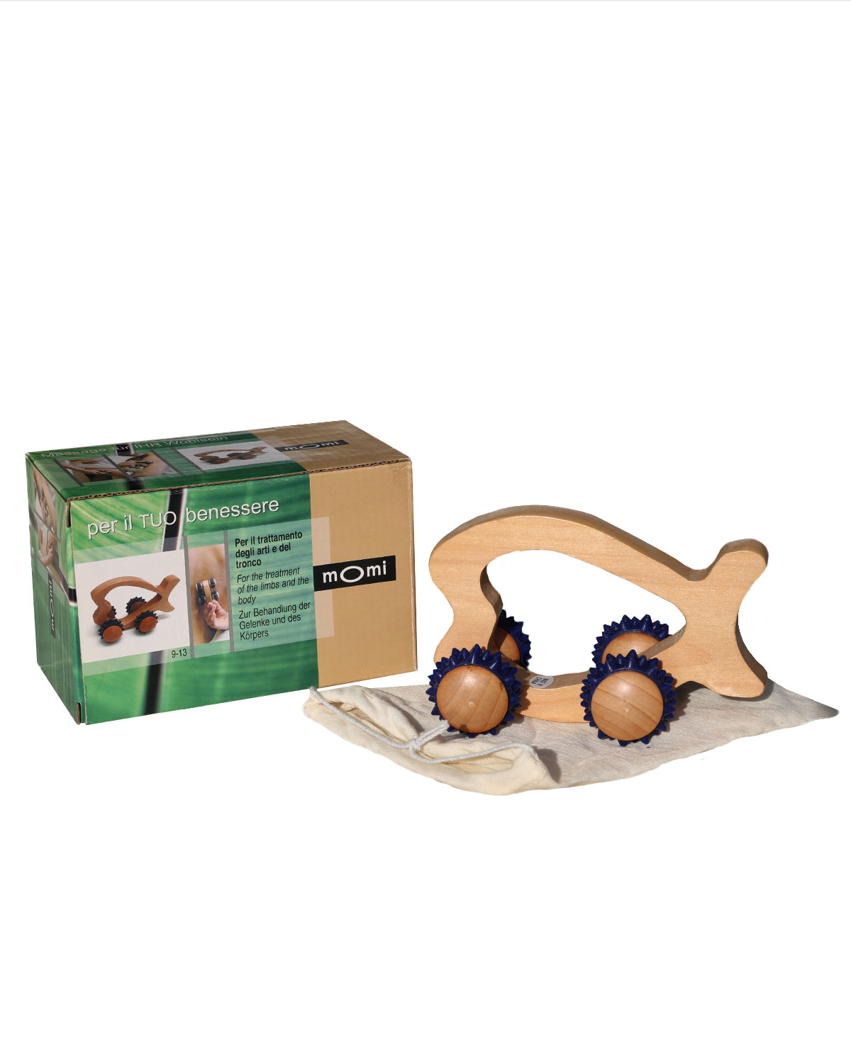 realizzati in legno di ottima qualita’, con rotelle massaggianti morbide e resistenti, si possono usare manualmente su tutte le parti del corpo, direttamante sulla pelle o interponendo un indumento leggero di cotone naturale. Dotati di un sacchettino in puro cotone naturale non sbiancato e di una scatola illustrata con istruzioni all’ interno. Forma a pesciolino. Misure: cm 12 x 6,5, altezza cm 8.