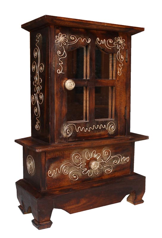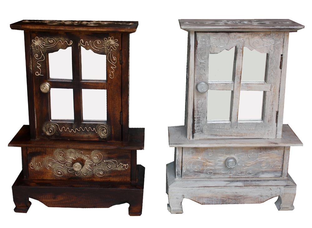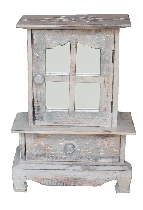realizzati in legno intagliati e dipinti a mano, mobiletti portagioie con specchio, disponibili color BIANCO decapato con decori argento. Misure: cm 12 x 28, h cm 40.