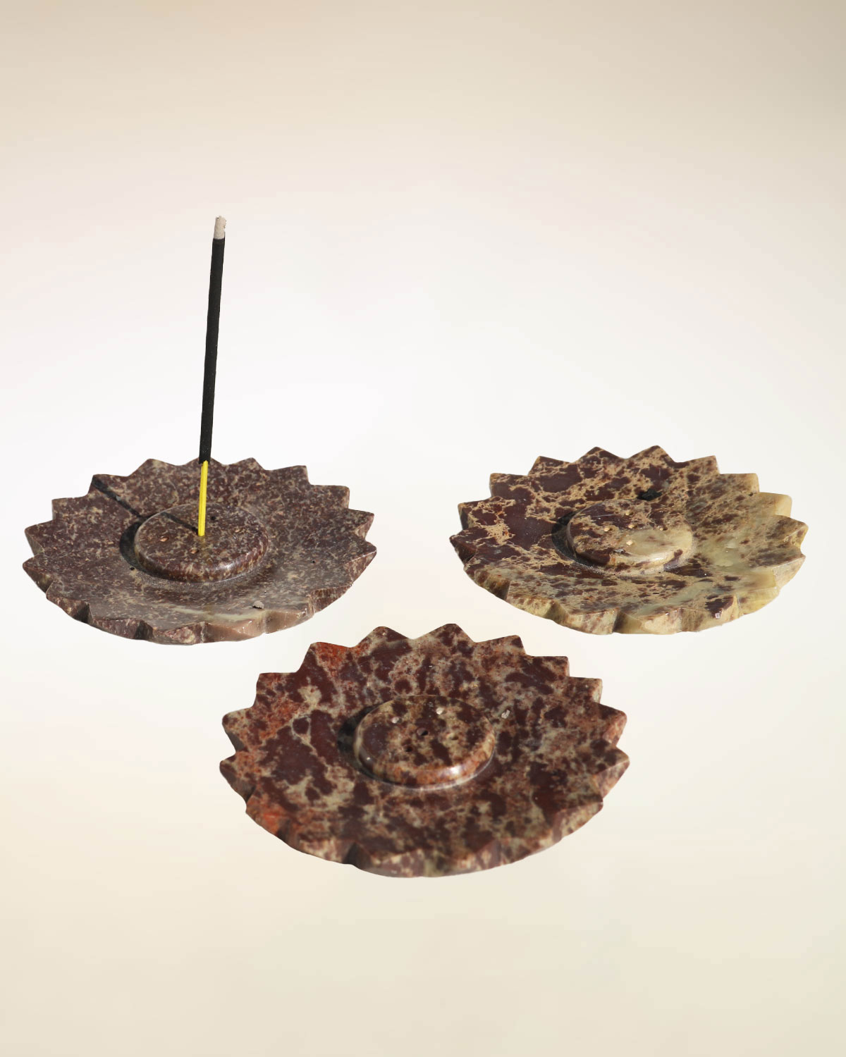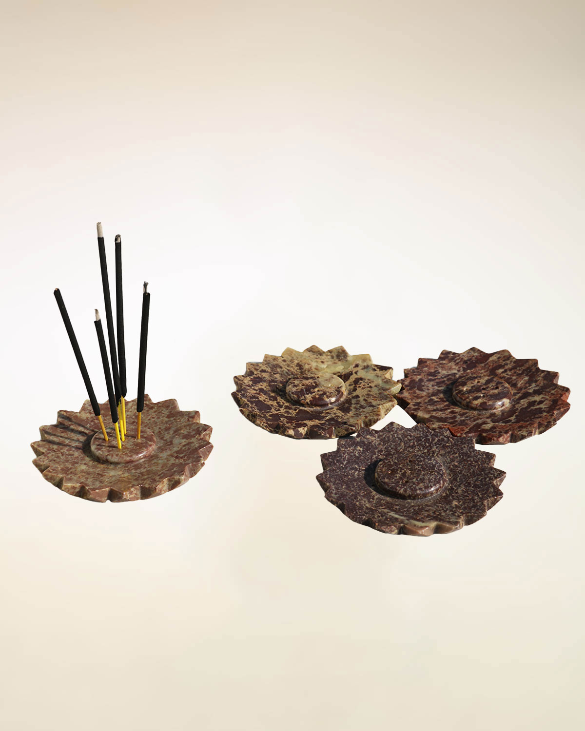 Originali portaincensi a forma di loto realizzati in pietra saponaria o marmo indiano, per bruciare incensi in bastoncino, con 5 fori, o per conetti, da appoggiare nel centro. Disponibili color pietra naturale lucidata. Misure: Diametro cm 9, h 0,60.