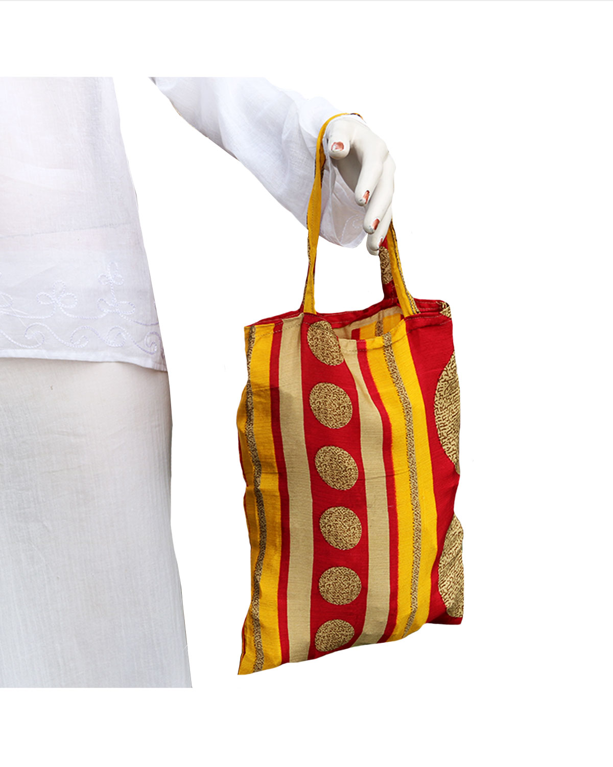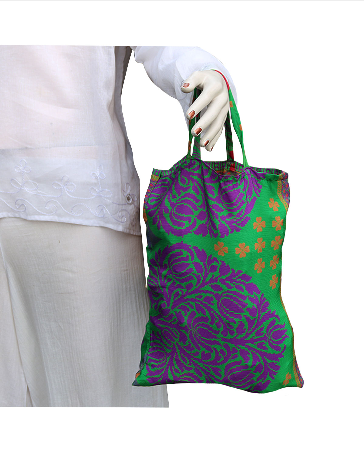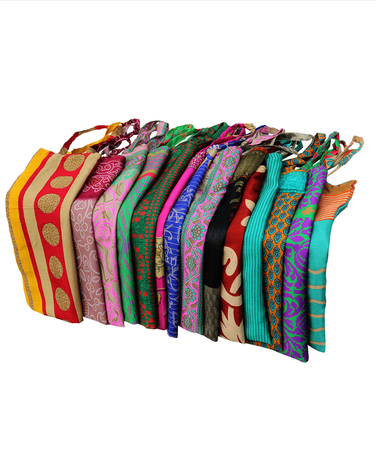 Funzionali e graziose sacche realizzate in misto seta-viscosa con sari indiani in India, cucite artigianalmente, dotate di comodi manici. Ideali per trasportare oggetti non pesanti, da emergenza in borsetta, confezionare regali in modo elegante ed ecosostenibile, riutilizzabili, per imbustare un capo d’abbigliamento o anche per conservare scarpe o ciabattine. Disponibili in colori e fantasie assortite. Misure cm 30 x 36 circa, con manici cm 55. Le sacche possono essere fornite in colori assortiti. E’ possibile indicare la scelta dei colori di base, ma non le tipologie di fantasia in quanto sono tutte diverse fra di loro.Disponibili in set da 12 pz. assortite.
