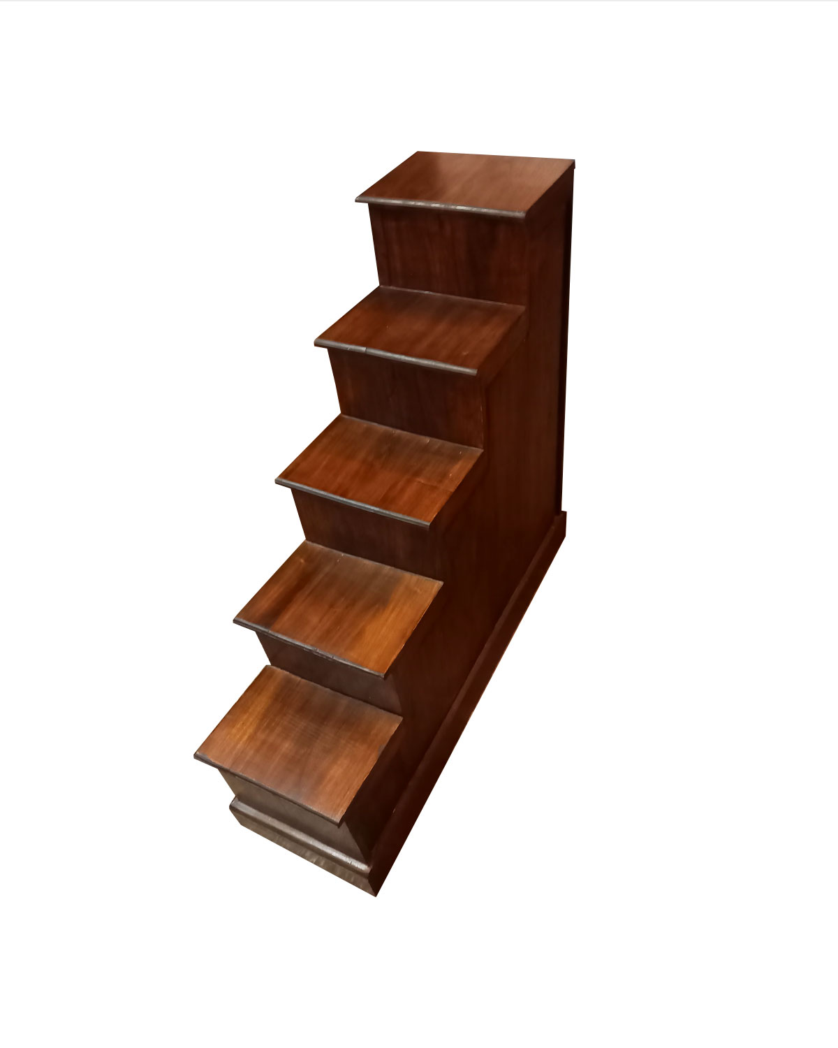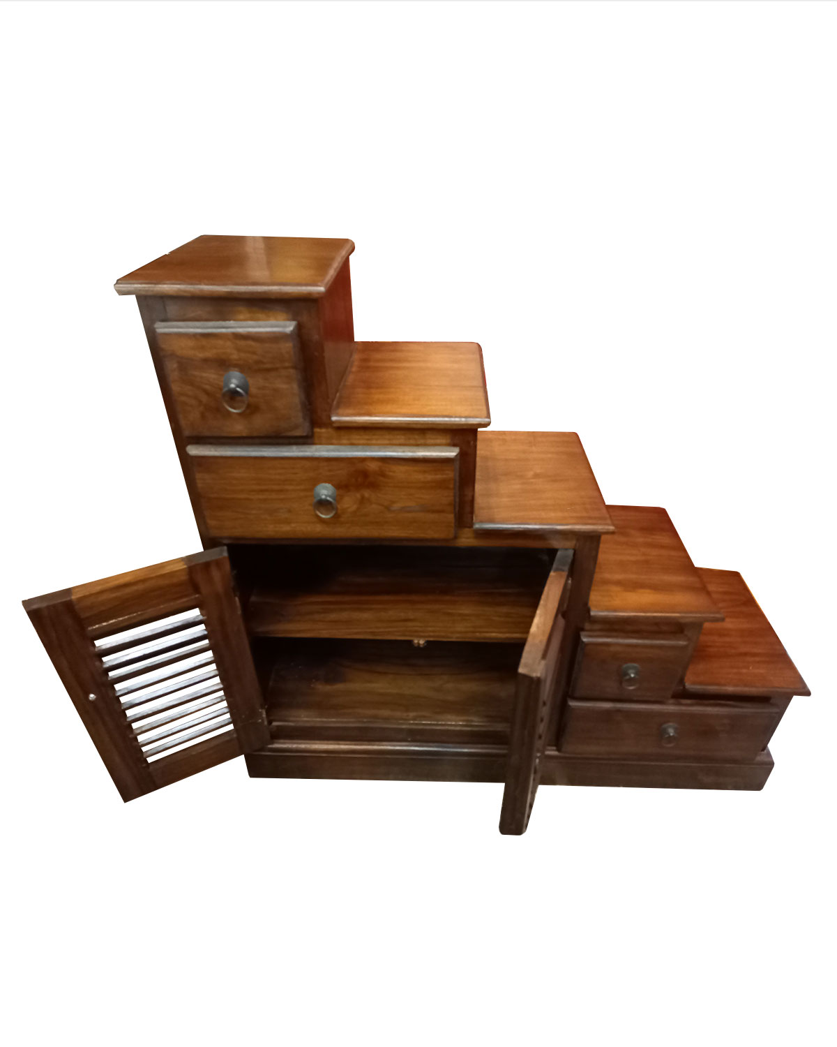 Funzionale e decorativa scaletta con 2 antine e 4 cassetti realizzata da falegnami indonesiani in legno di teak massello con tecniche artigianali. Le antine sono realizzate in stile anta veneziana- Dalla forma particolare è dotata di manigliette ad anello nere antichizzate. Si sviluppa dall’ alto verso il basso in direzione sinistra. Disponibile color noce scuro. Misure: larghezza base cm 90, profondità cm 28, altezza cm 82, gradini cm 21 x profondità cm 28.Chilogrammi 22 circa.
