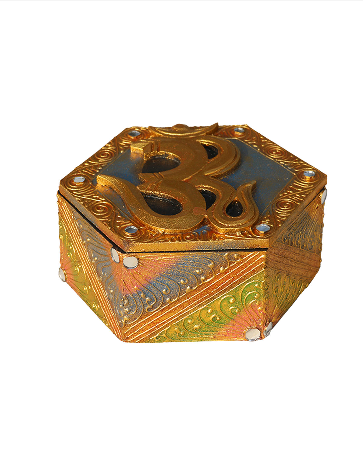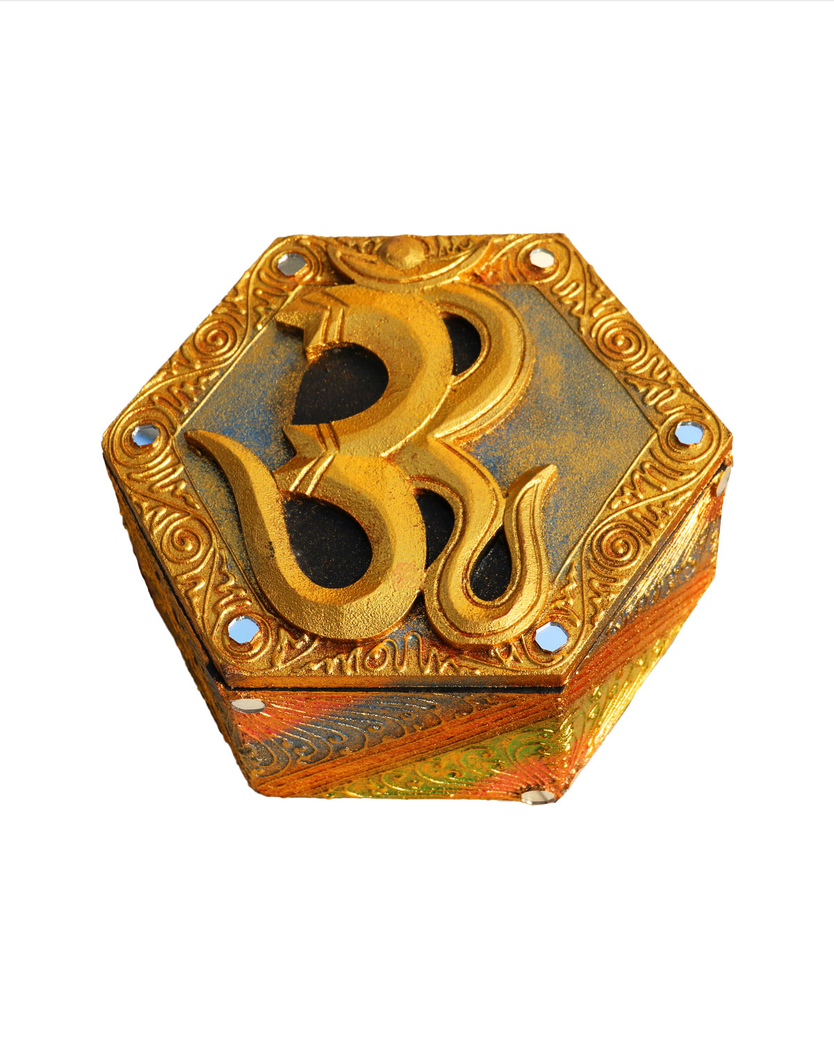 Scatole con om intagliato in rilievo, realizzate a mano da abili artigiani indonesiani. Originali contenitori dorati impreziositi da decori e specchietti, ove riporre piccoli oggetti preziosi. Donano un originale e sacro tocco etnico ad ogni ambiente. Misure: esagono di lato cm 9,5, larghezza cm 19 x 17, h cm 8,5. Disponibili color oro come foto.