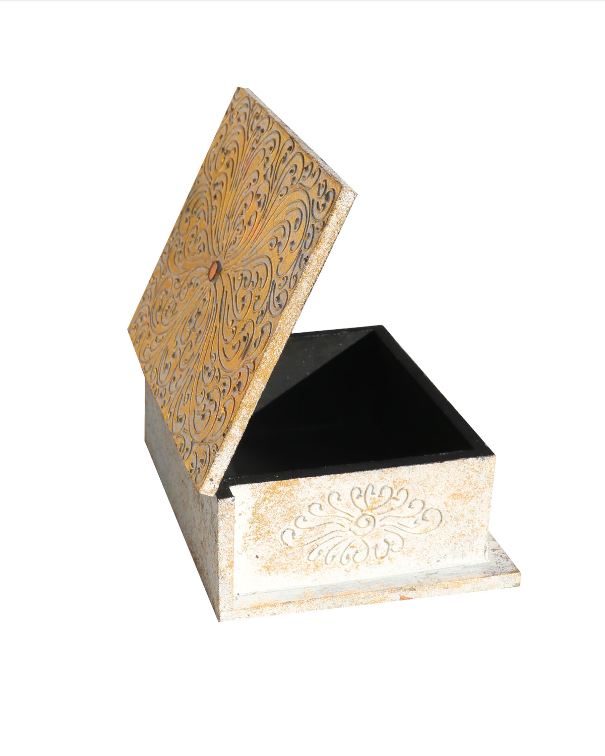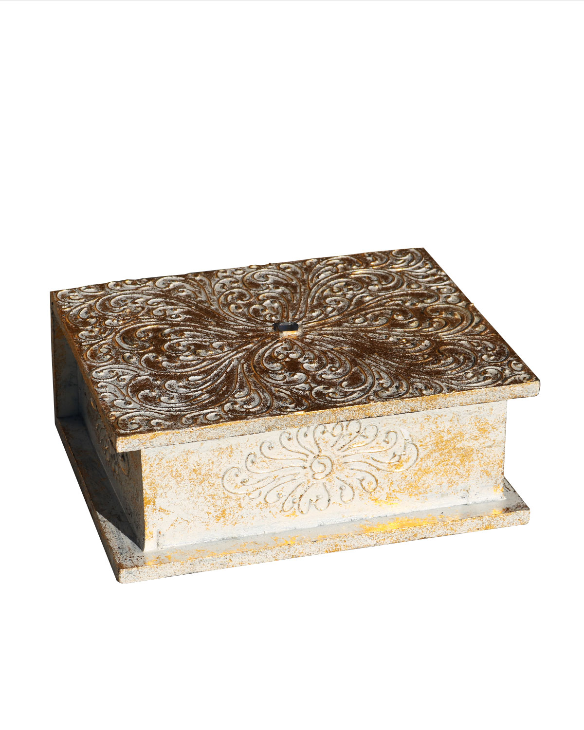 Delicate scatole in legno esotico interamente intagliate e dipinte a mano da artigiani indonesiani, finemente lavorate e curatissime. Dalla forma a cofanetto sono realizzate con una decorazione tipicamente orientale in rilievo. Utili per monili, piccoli oggetti o portamonete, belle per dare un elegante tocco etnico all’ ambiente. Disponibili in bianco con sfumature oro o bianco con sfumature argento. Misure: cm 15 x 19, h cm 7,5.