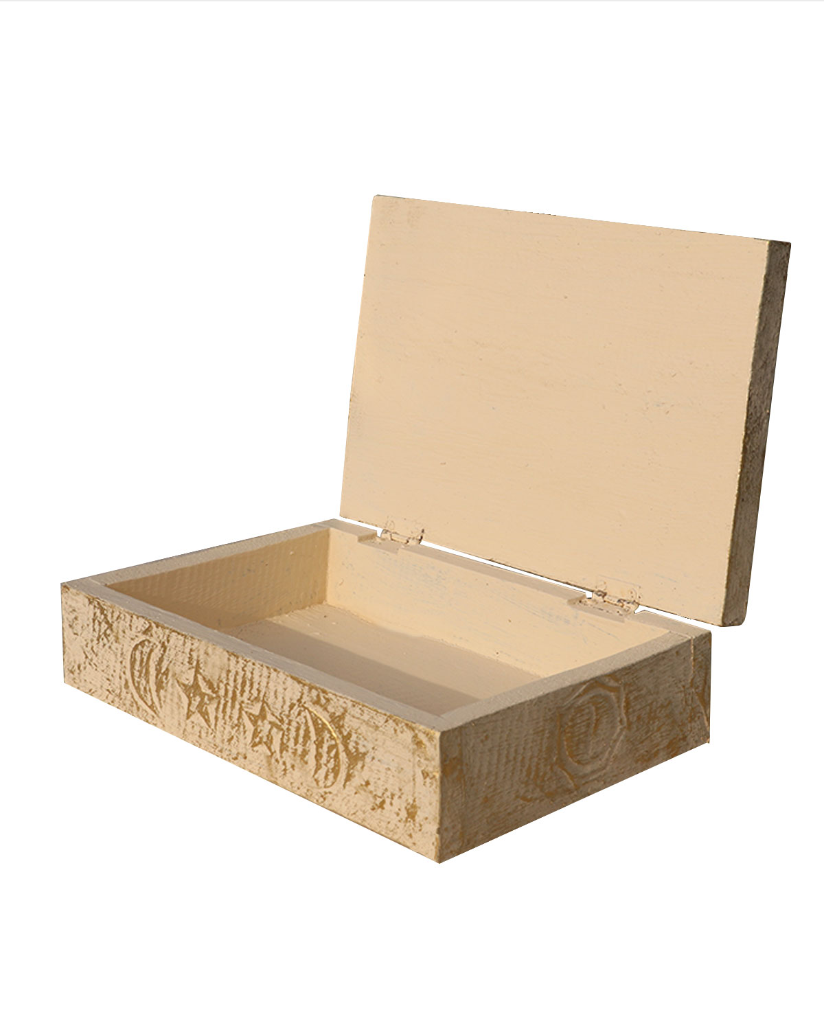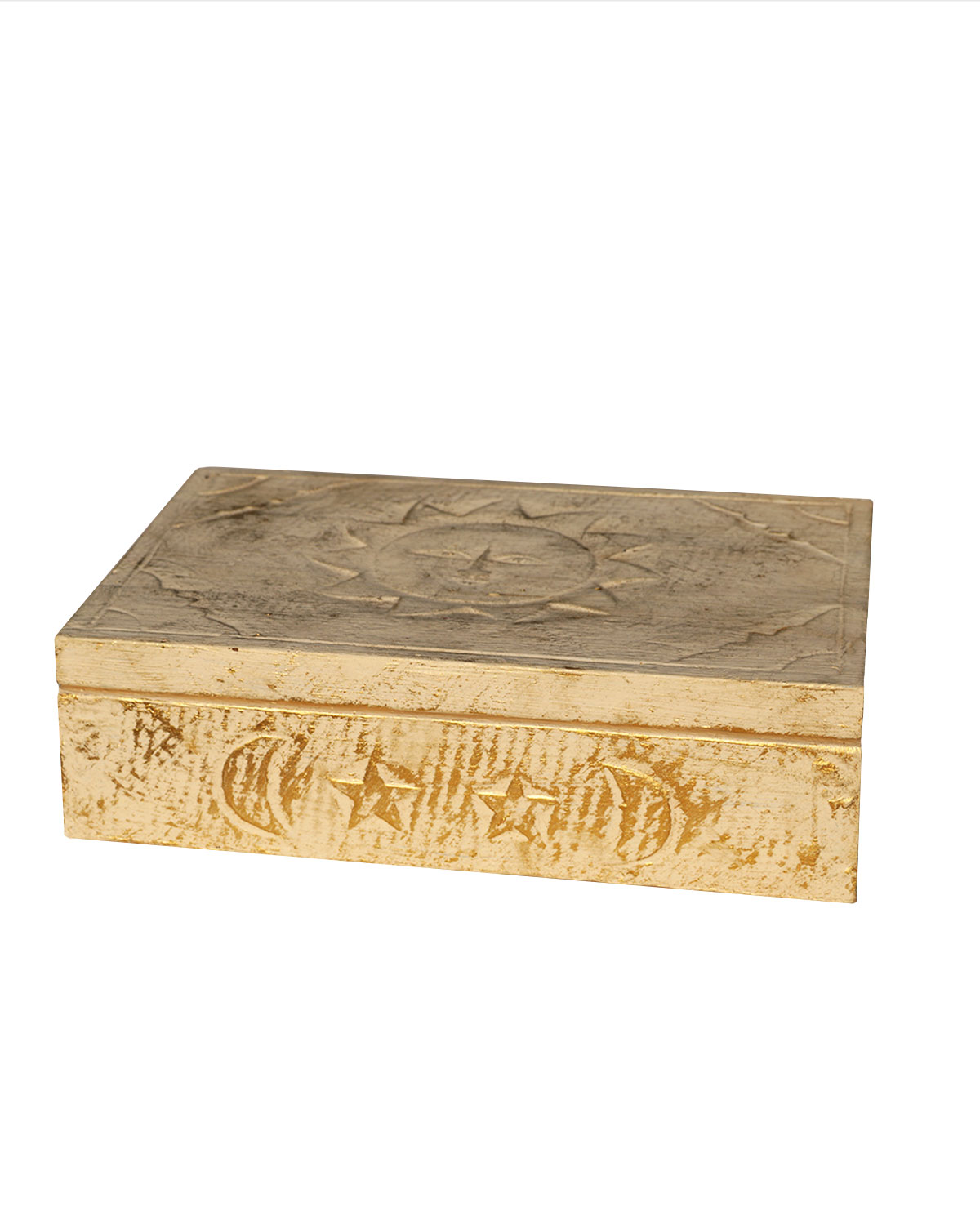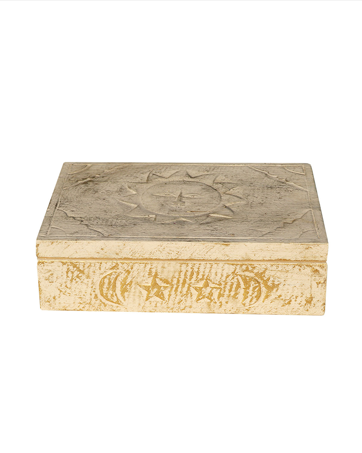 Capiente scatola rettangolare realizzata da artigiani indonesiani, utile per riporvi piccoli oggetti o monili. Scatola con motivi intagliati sui fianchi e sole sul coperchio. Disponibile color bianco decapato con oro. Misure: cm 25 x 17 x h 7,5.