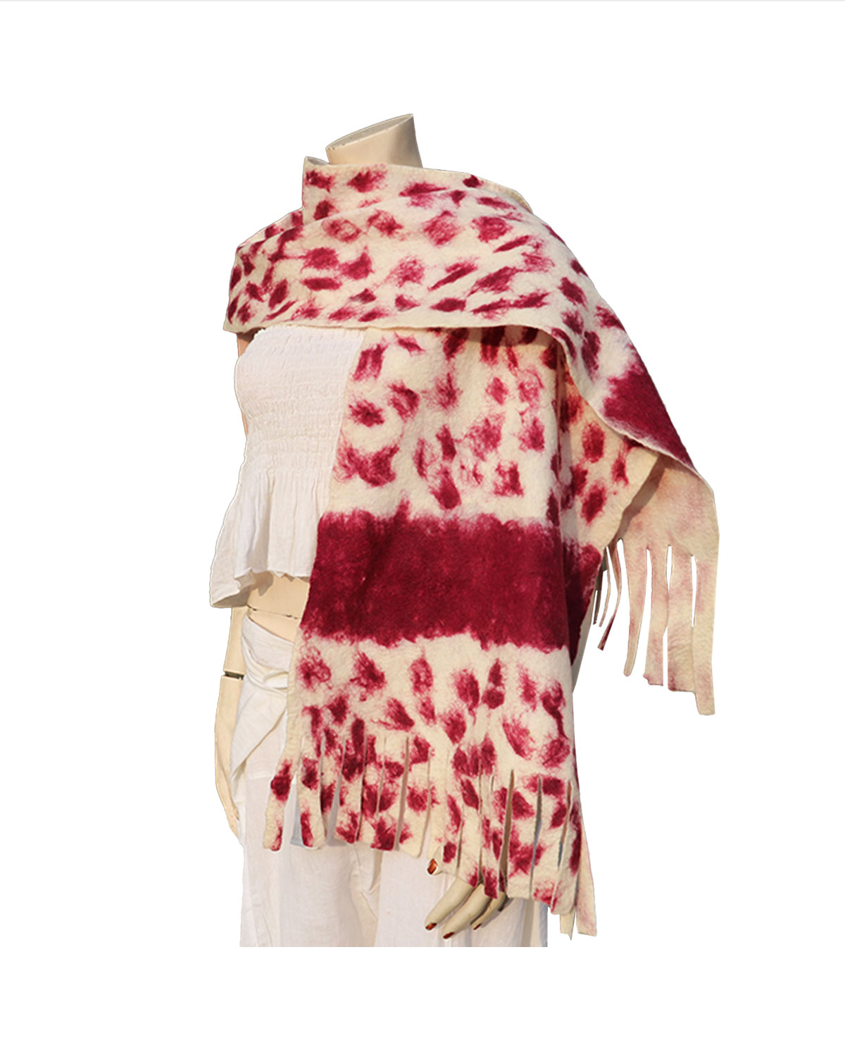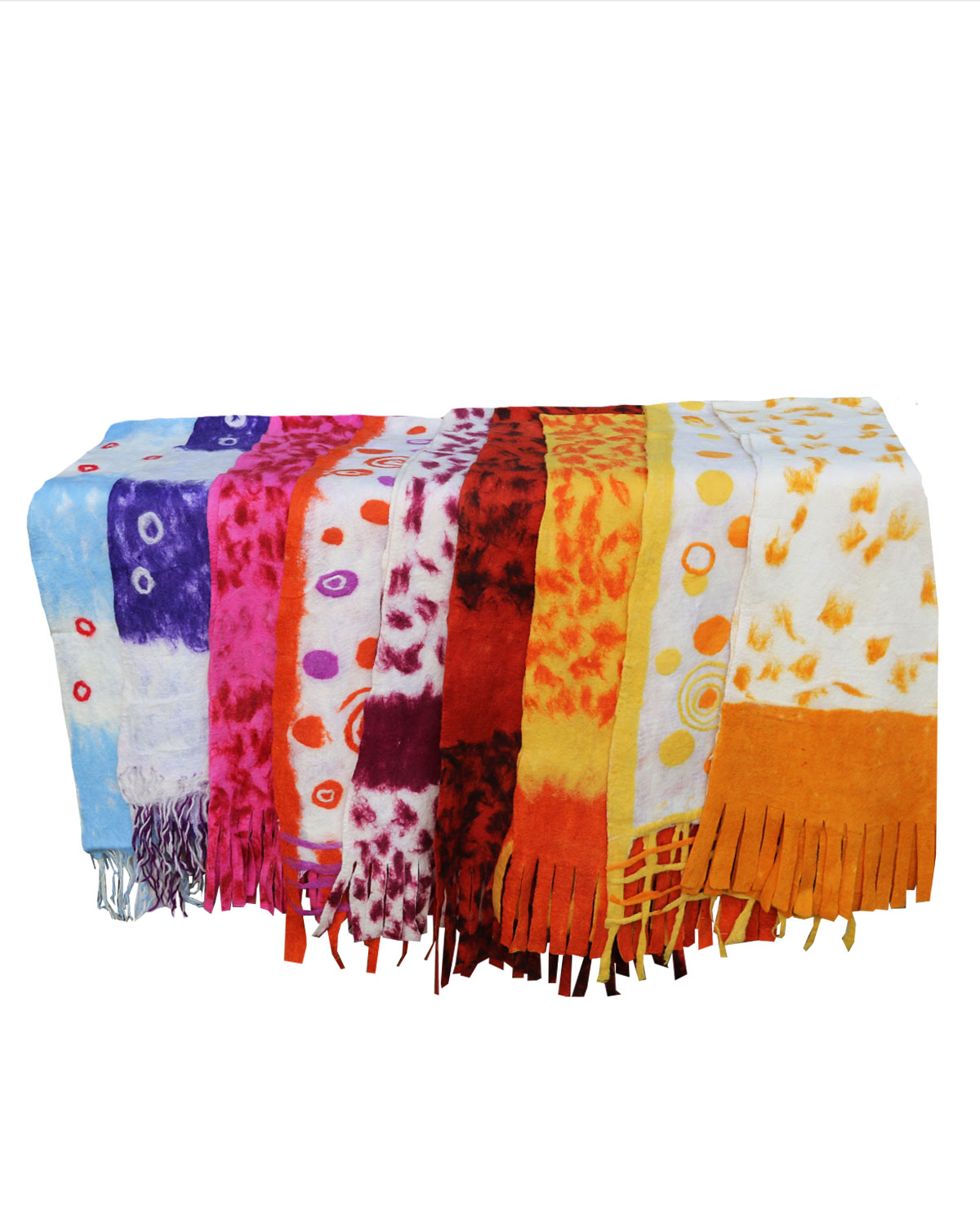 Ampie e morbide sciarpe realizzate in pura lana cotta da sarti nepalesi utilizzando tecniche artigianali e tradizionali tipiche del Nepal . Calde ed avvolgenti sono decorate con pois giganti e spirali e dotate di frange. Indossate donano un tocco di colore etnico proteggndo dalle giornate più rigide. Disponibili in colori assortiti, come da foto. Misure: larghezza cm 36-42, lunghezza cm 200-210 circa a seconda del modello.