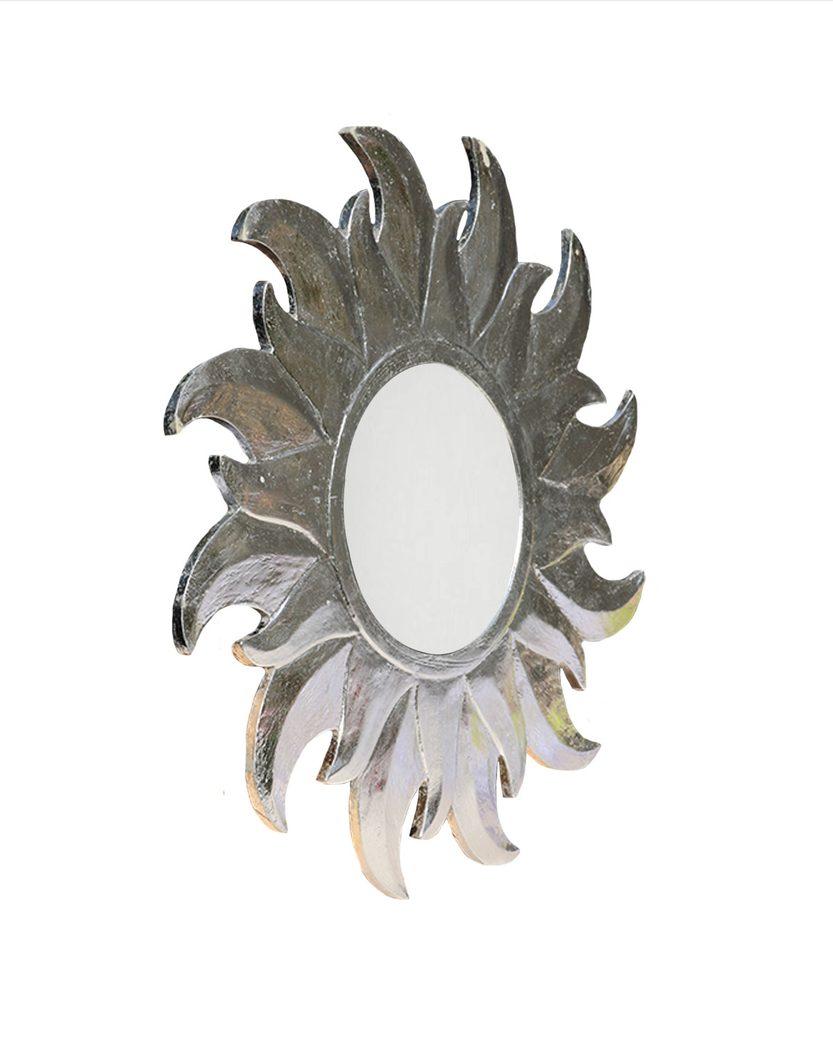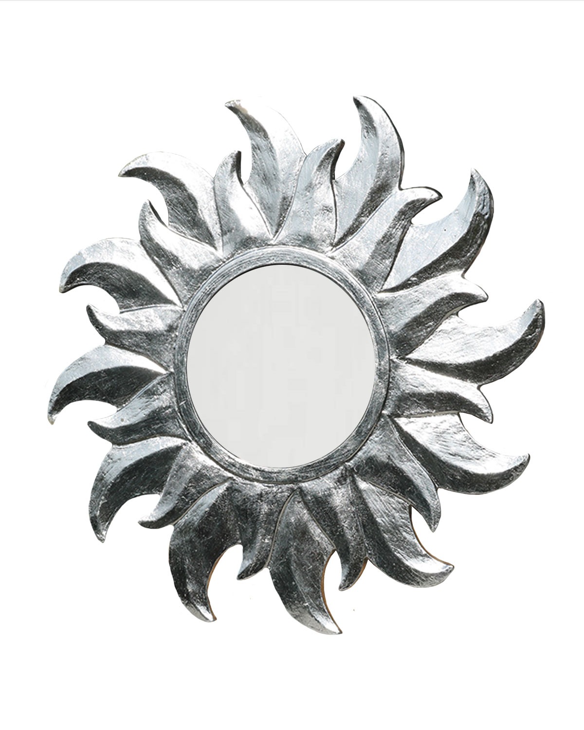 Delicati e luminosi specchi con raggi, realizzati in legno esotico indonesiano con tecniche manuali da artigiani locali. A forma di sole. Disponibili color argento. Misure: diametro cm 40, diametro solo specchio cm 15, spessore mm 8.