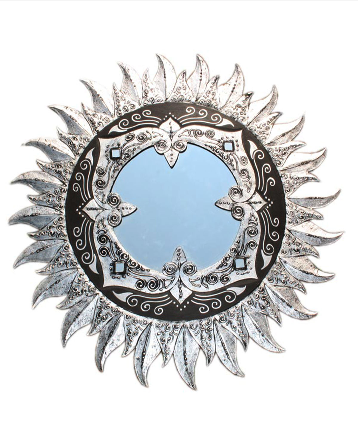 Originali e luminosi specchi a forma di sole con raggi realizzati in legno esotico intagliati e dipinti a mano da artigiani indonesiani, con tecniche artigianali. Intagliati a mano vengonopoi decorati con motivi orientaleggianti a rilievo, impreziositi da specchietti e dipinti a mano con pazienza, donanndo all’ oro e all’ argento un effetto antichizzato. Specchi particolari si adattano ad ogni ambiente, sia moderno che etnico, donando un tocco di luce…orientaleggiante. Disponibili color oro o argento con particolari neri. Dotati di attaccaglia. Misure: diametro cm 80, spessore mm 5.