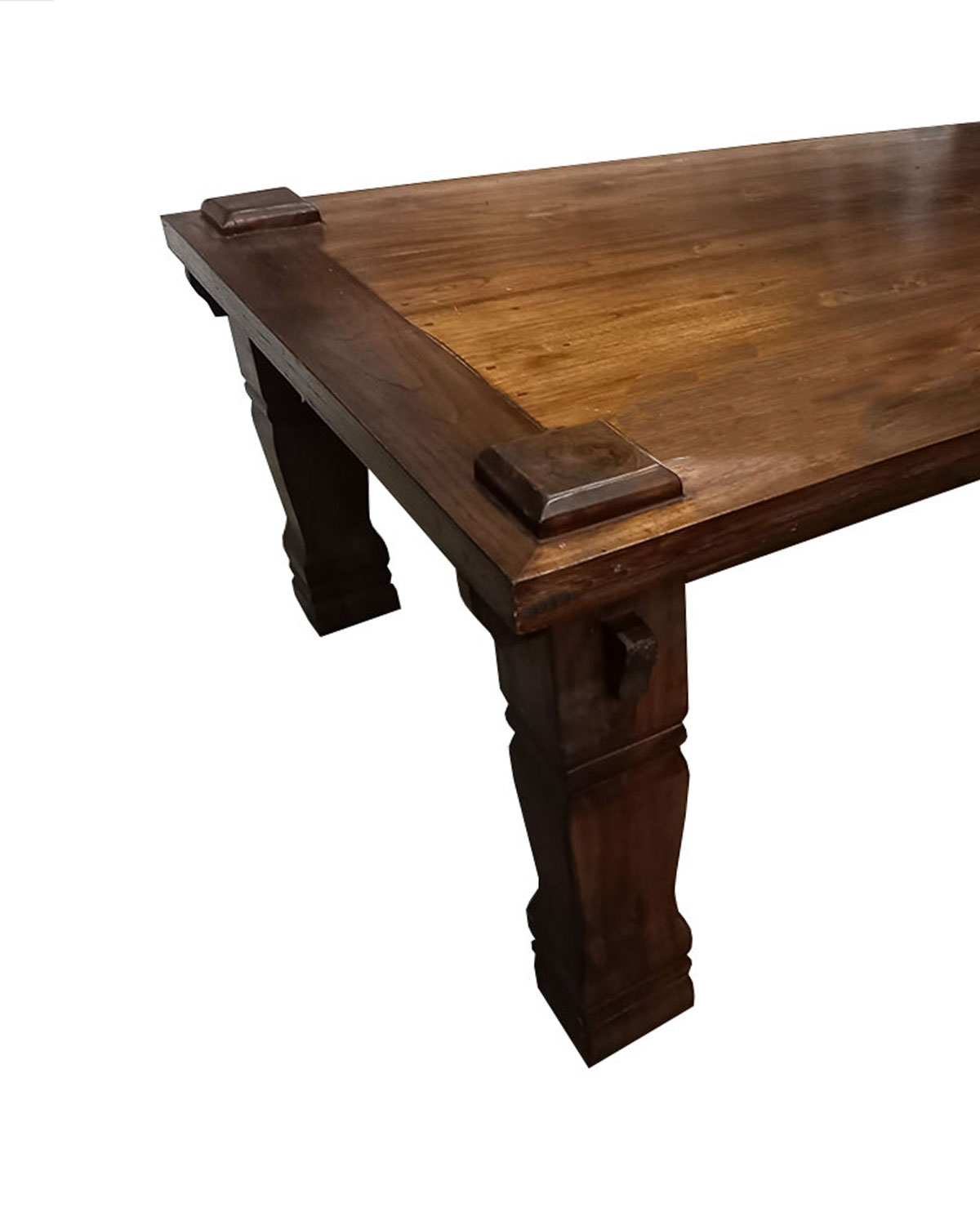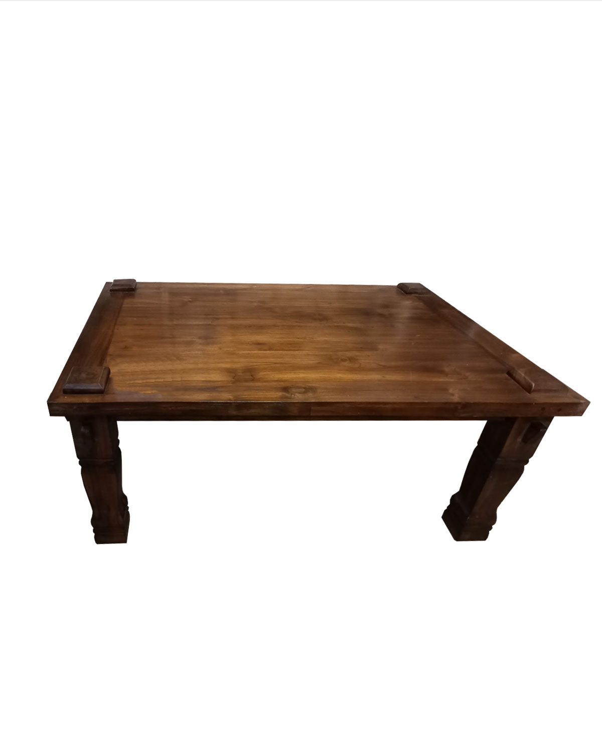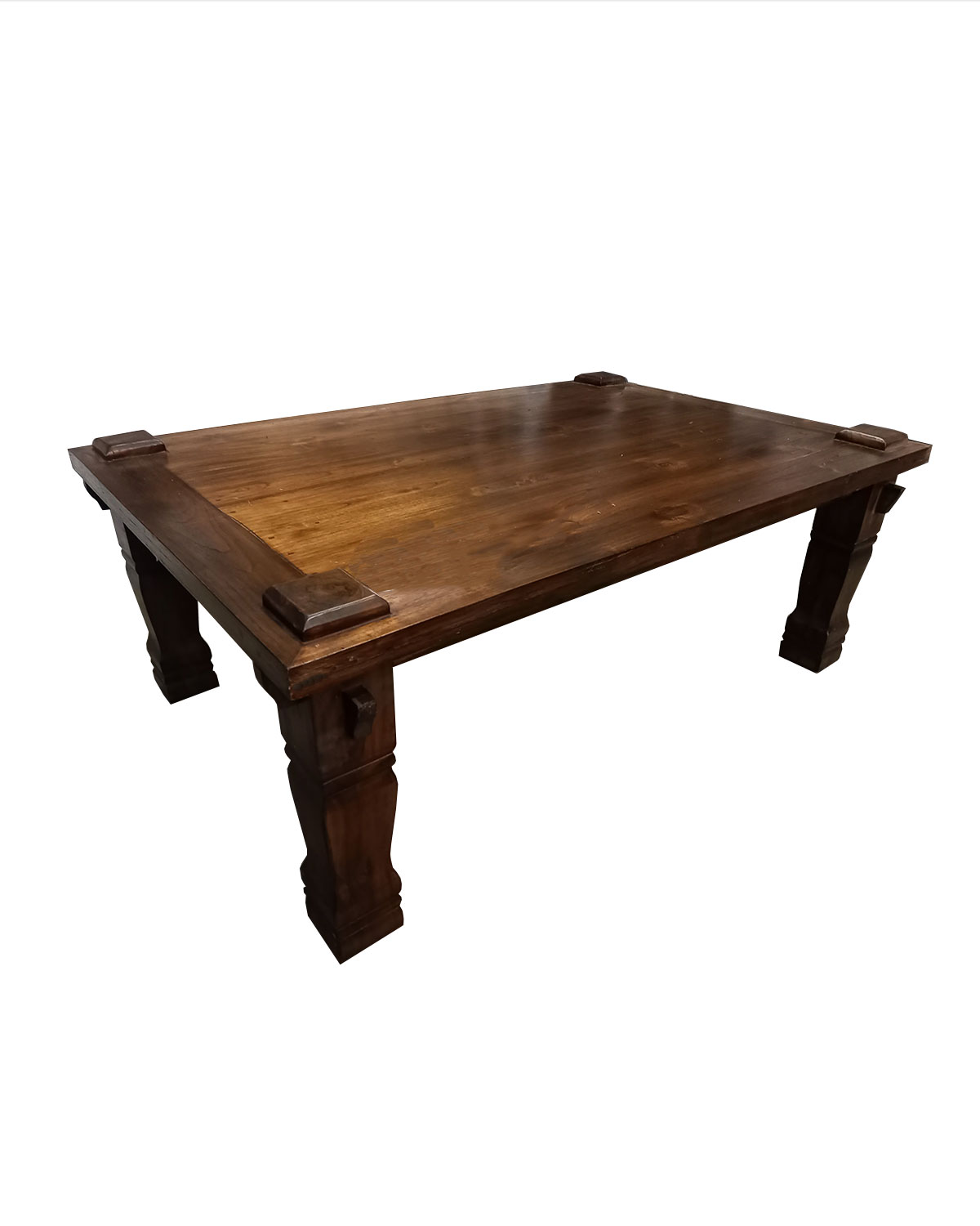 Bellissimo tavolino basso stile arte povera realizzato con tecniche artigianali da falegnami indonesiani in legno di teak massello. Dotato di robustissimo piano con quattro borchie sugli angoli e gambe sagomate molto robuste e importanti, piuttosto pesante. Bello per arredare una sala, un centro yoga , un centro olistico o anche uno studio o sala d’ aspetto. Disponibili color noce scuro. Misure: lunghezza cm 120 x larghezza cm 80, altezza cm 45.