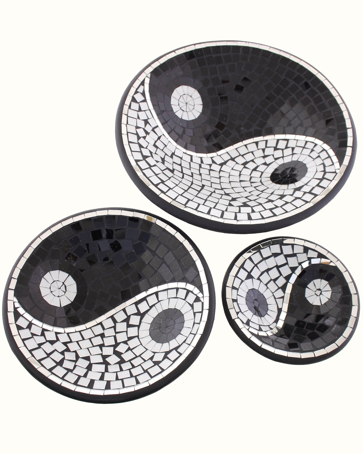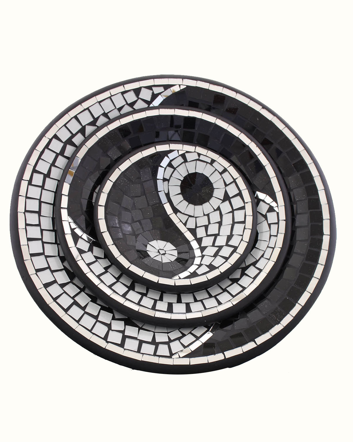 Bellissimi vassoi o piatti artigianali realizzati in terracotta, da artigani indonesiani, interamente ricoperti con mosaico di specchietti, formanti un tao. Disponibili color nero e bianco. Belli per ravvivare tavoli, librerie, mensole o scrivanie, semplicemente decorativi o utili, come svuotatasche, portafrutta o caramelle. Misure: diametro: grande cm 37-38 x h 9-10, medio cm 24-28 x h 7, piccolo cm 20 x h 5 circa.