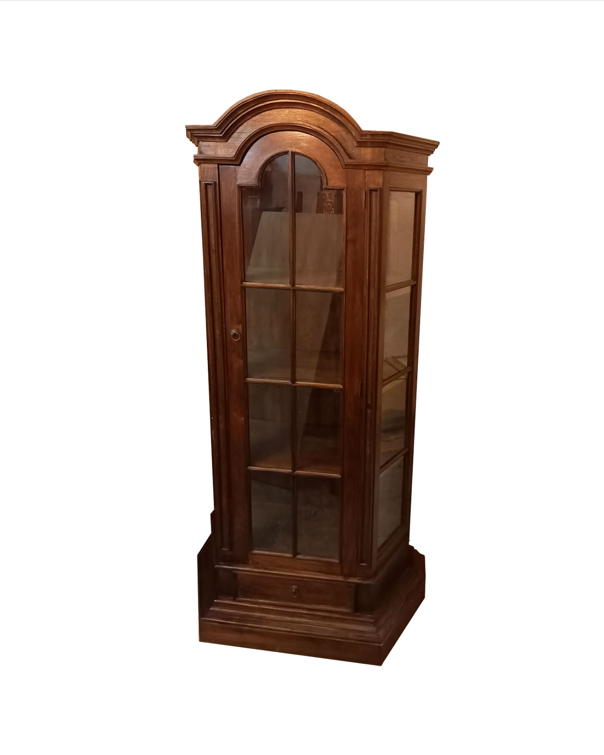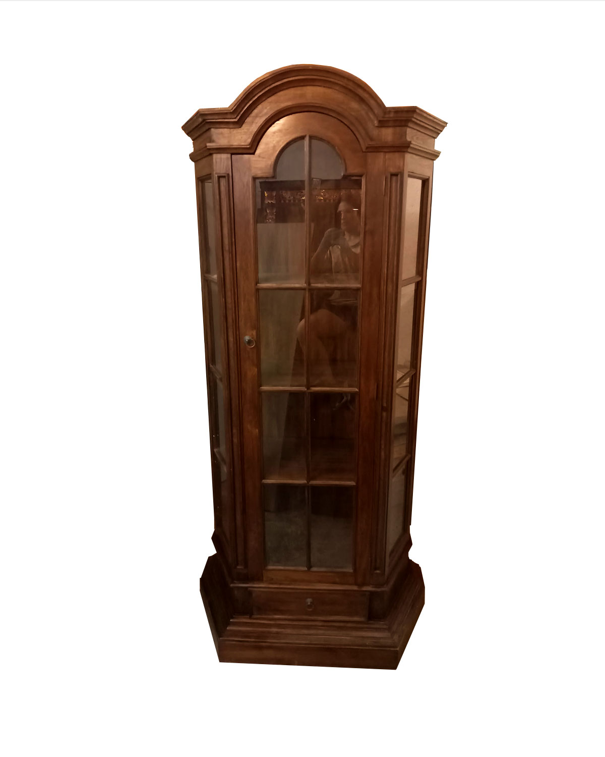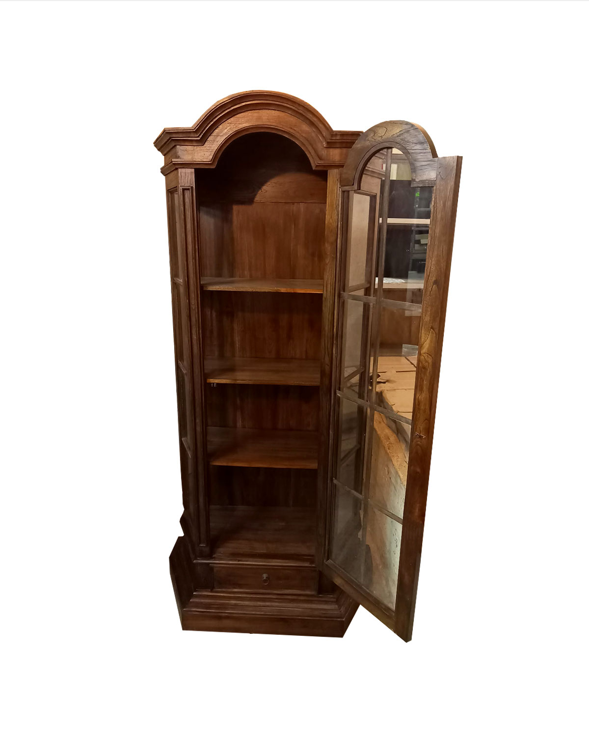 Bellissima ed elegante vetrinetta in stile con 3 ripiani e 4 appoggi realizzata con tecniche artigianali da falegnami indonesiani in legno di teak massello. Dotata di un’ anta vetrata con maniglietta in ferro antichizzato nero, cassetto sul fondo, generosa cornice sagomata in stile e ampio basamento che le conferisce stabilita’ e importanza. Disponibile color noce medio. Misure: base esagonale di cm 91, 12,5 x 32,5 x 62, larghezza fondo cm 91, larghezza davanti cm 62, profondità cm 37, altezza massima cm 185,5, altezza ai lati cm 175, peso 35 chilogrammi circa.